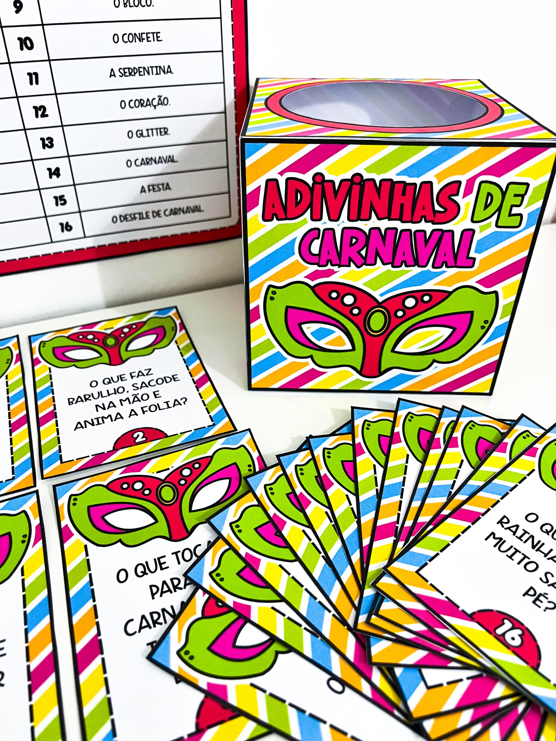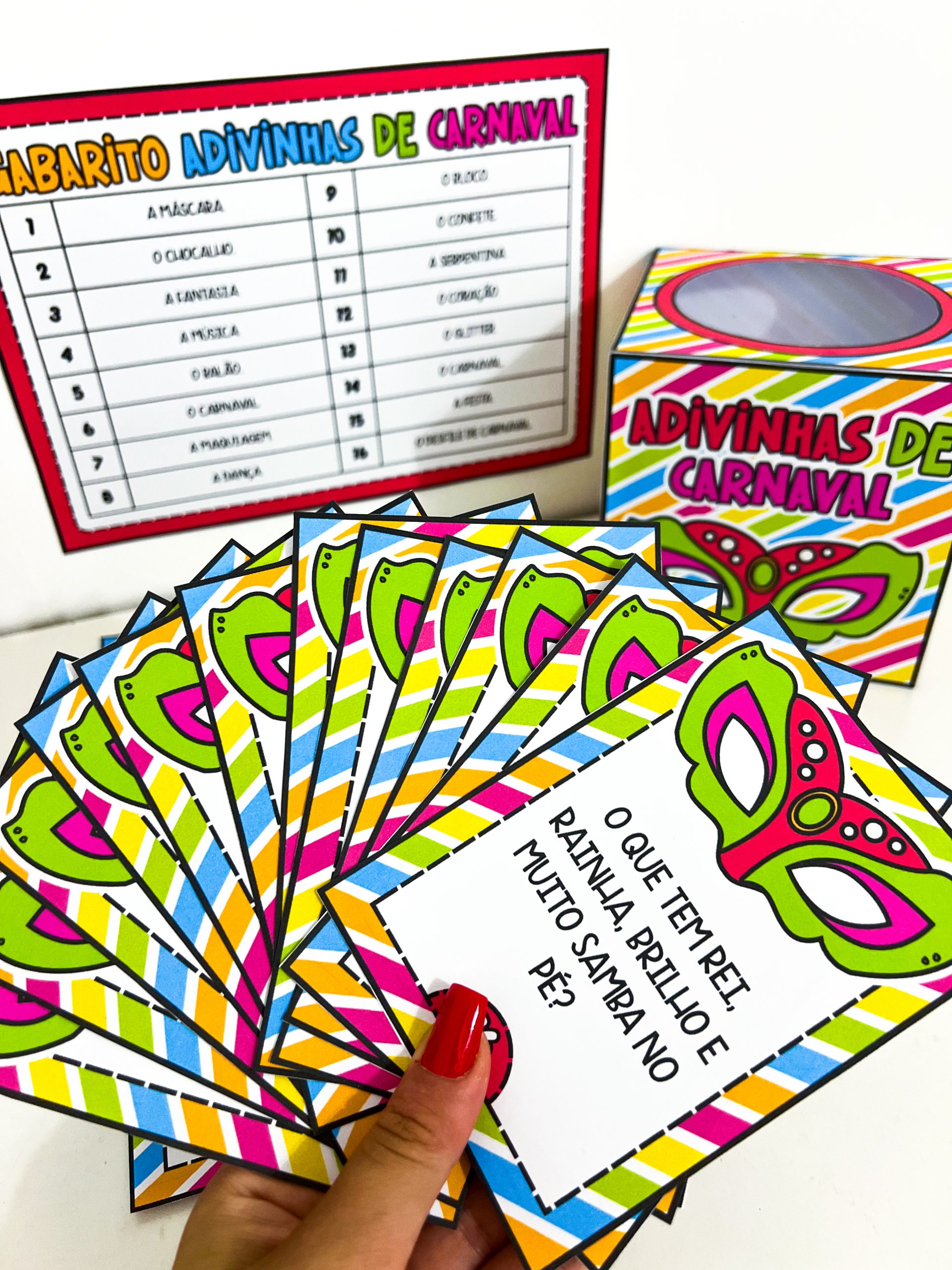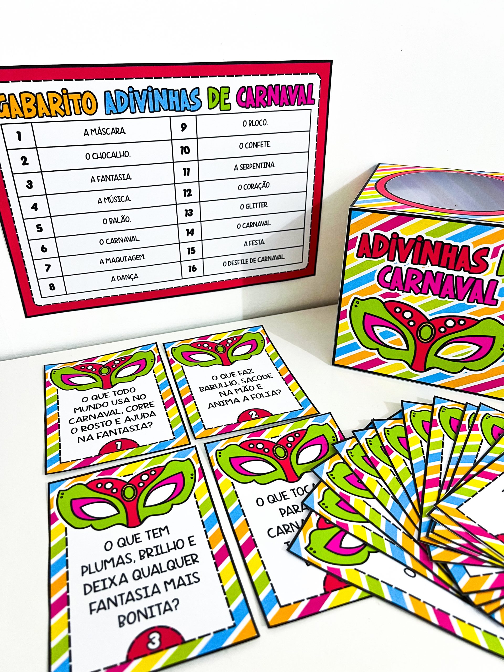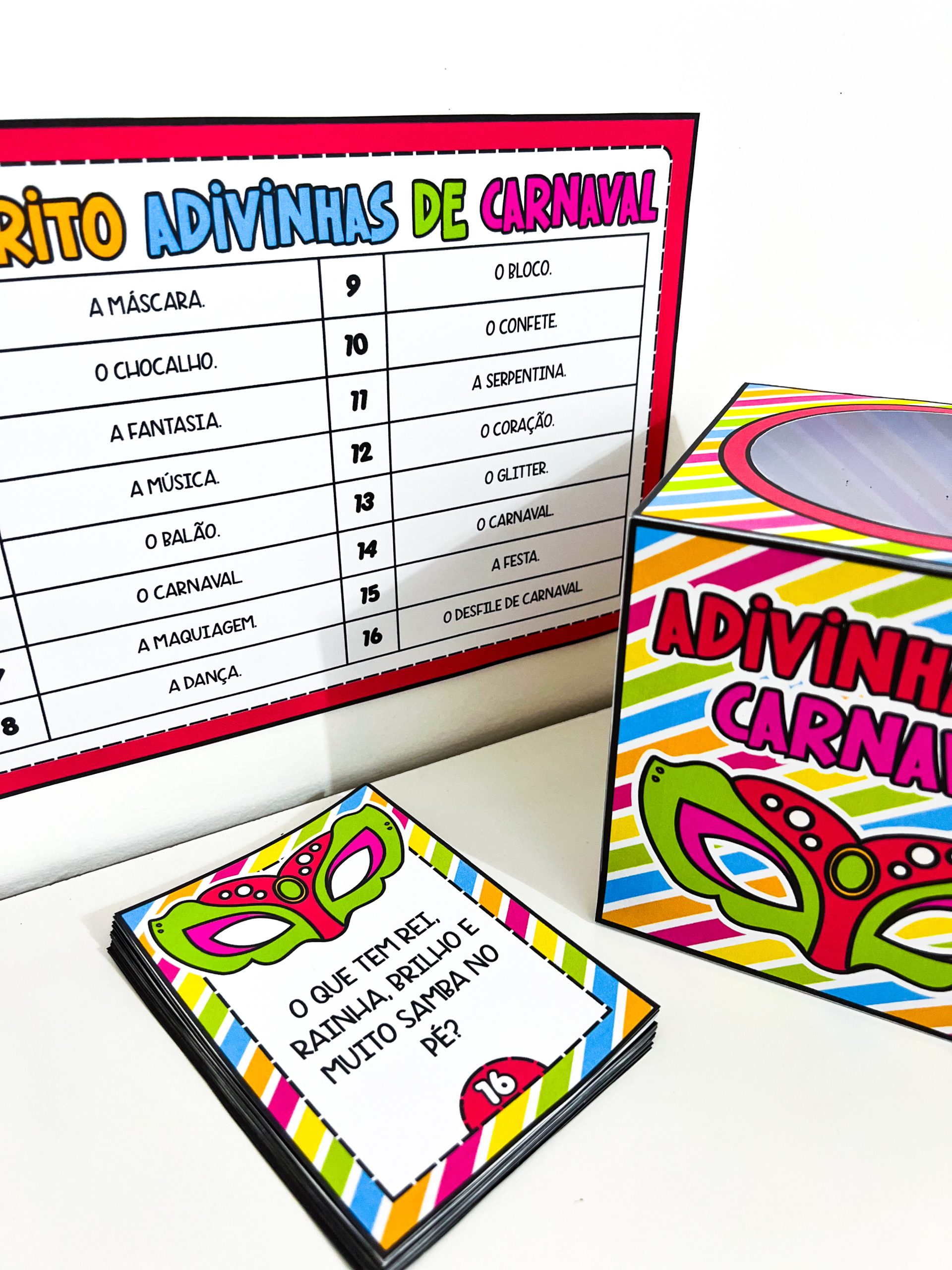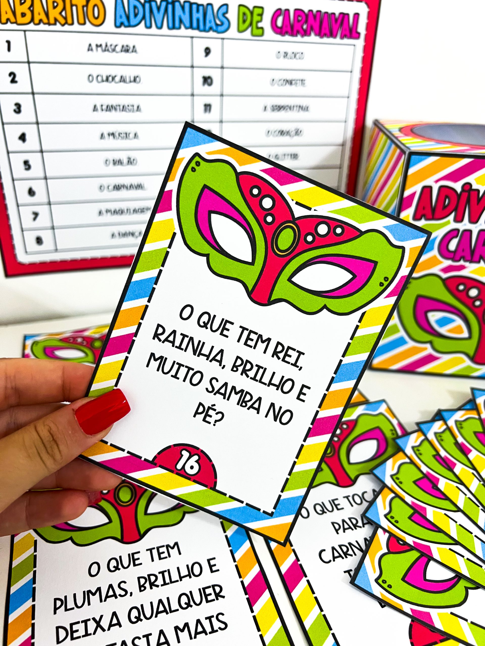 O conjunto contém um molde de caixa para guardar o material, 16 fichas de adivinhas com perguntas relacionadas ao Carnaval e um gabarito para conferência das respostas. É ideal para trabalhar em rodas de conversa, momentos de leitura, brincadeiras coletivas ou atividades especiais no período carnavalesco, promovendo a socialização e o aprendizado de maneira leve e prazerosa.