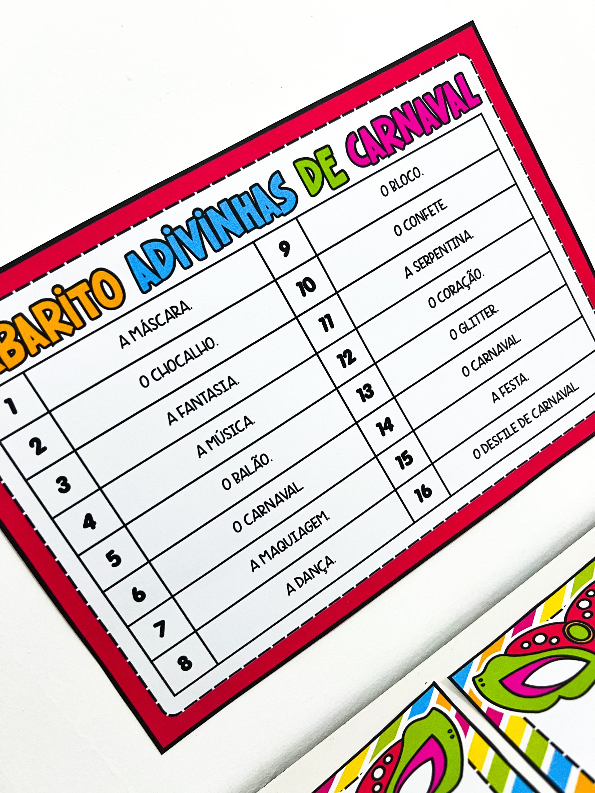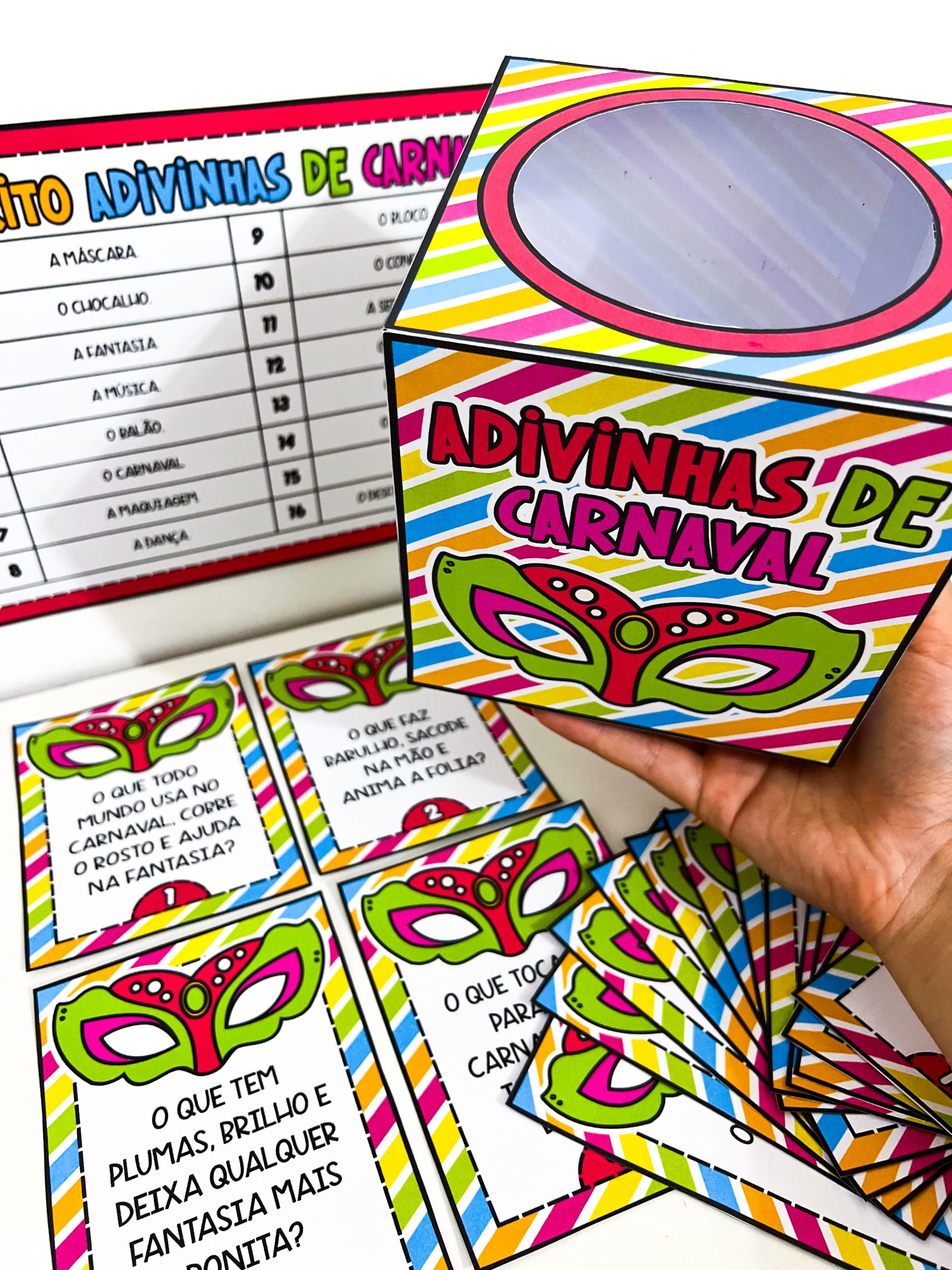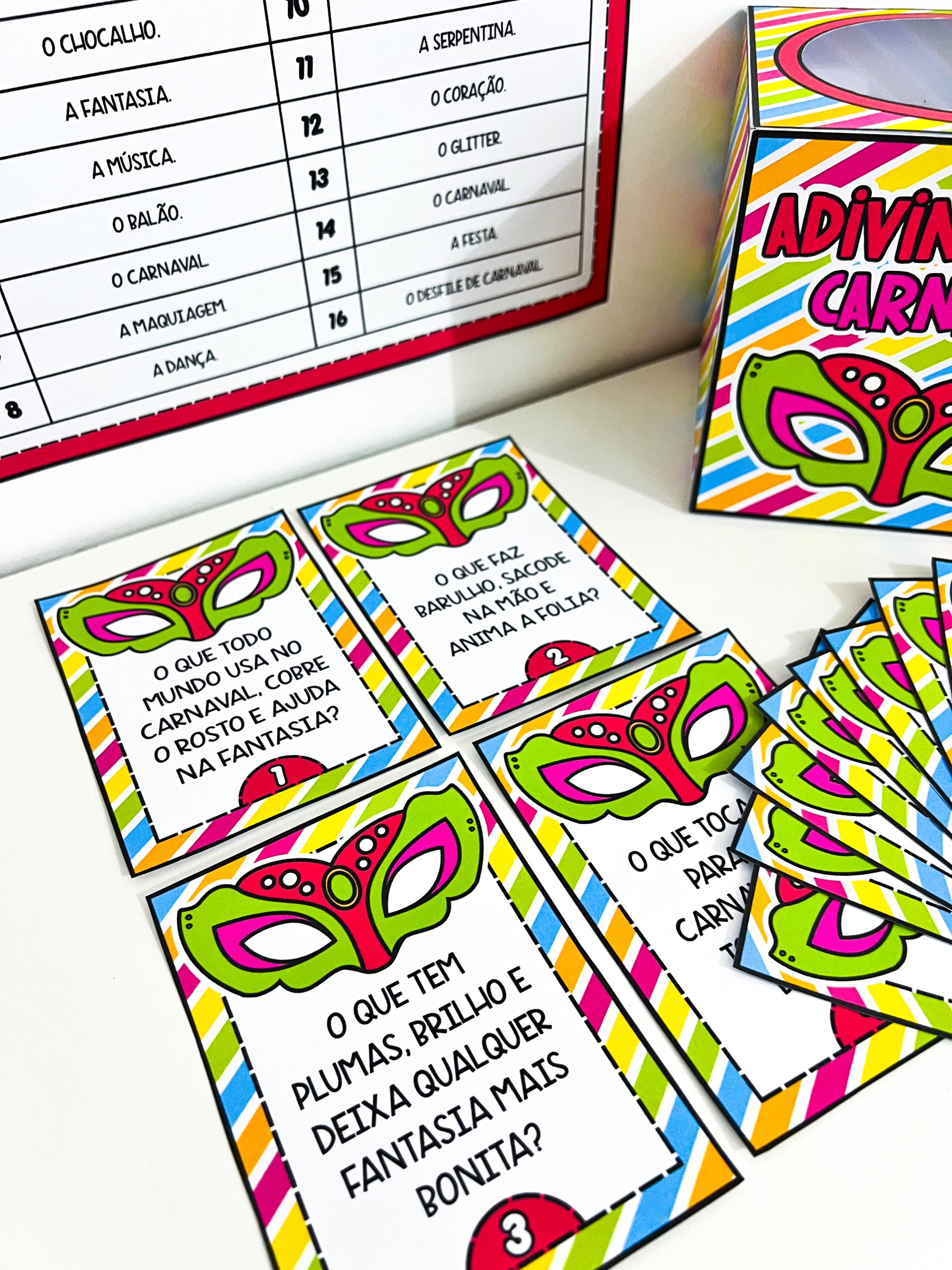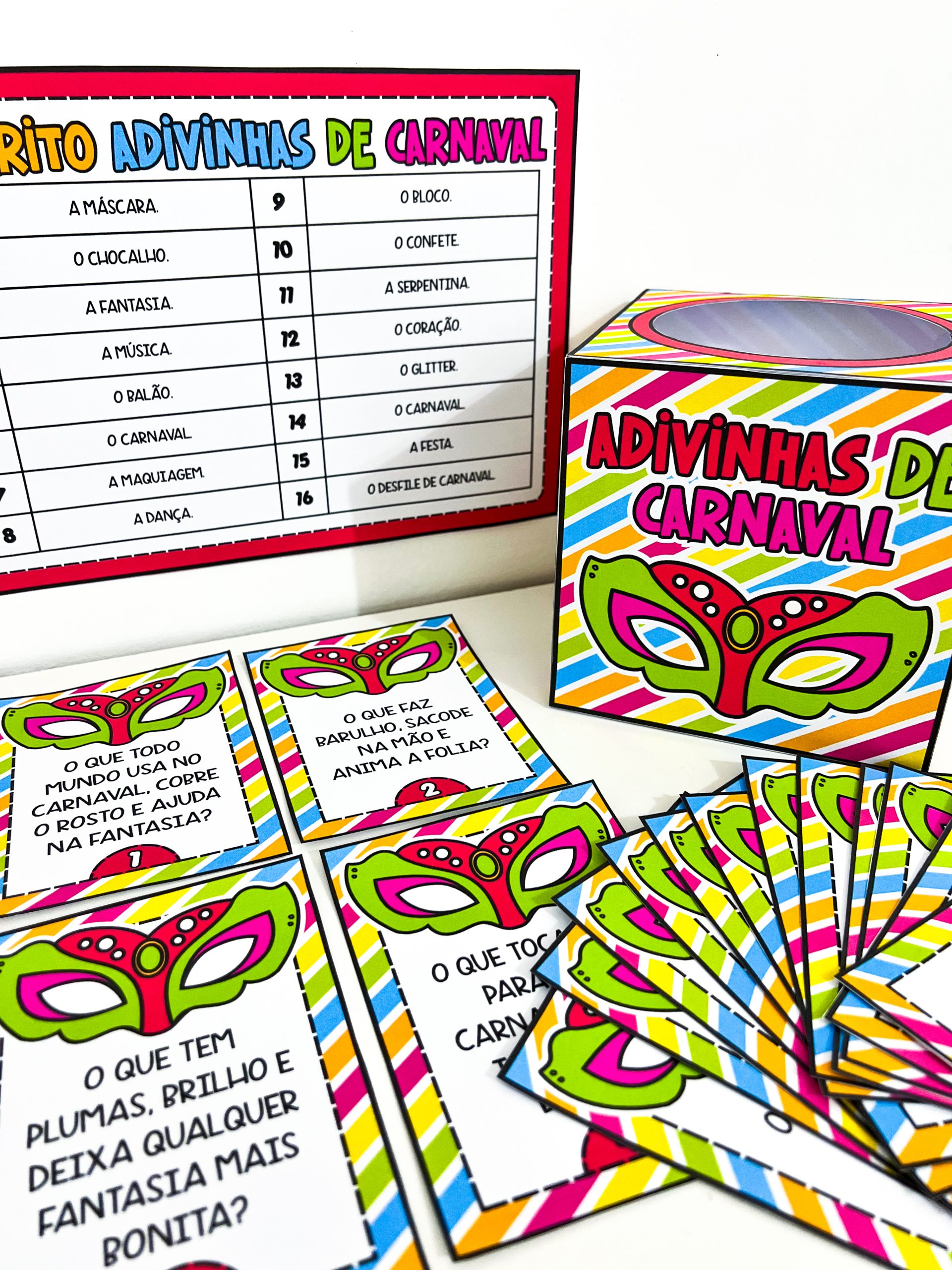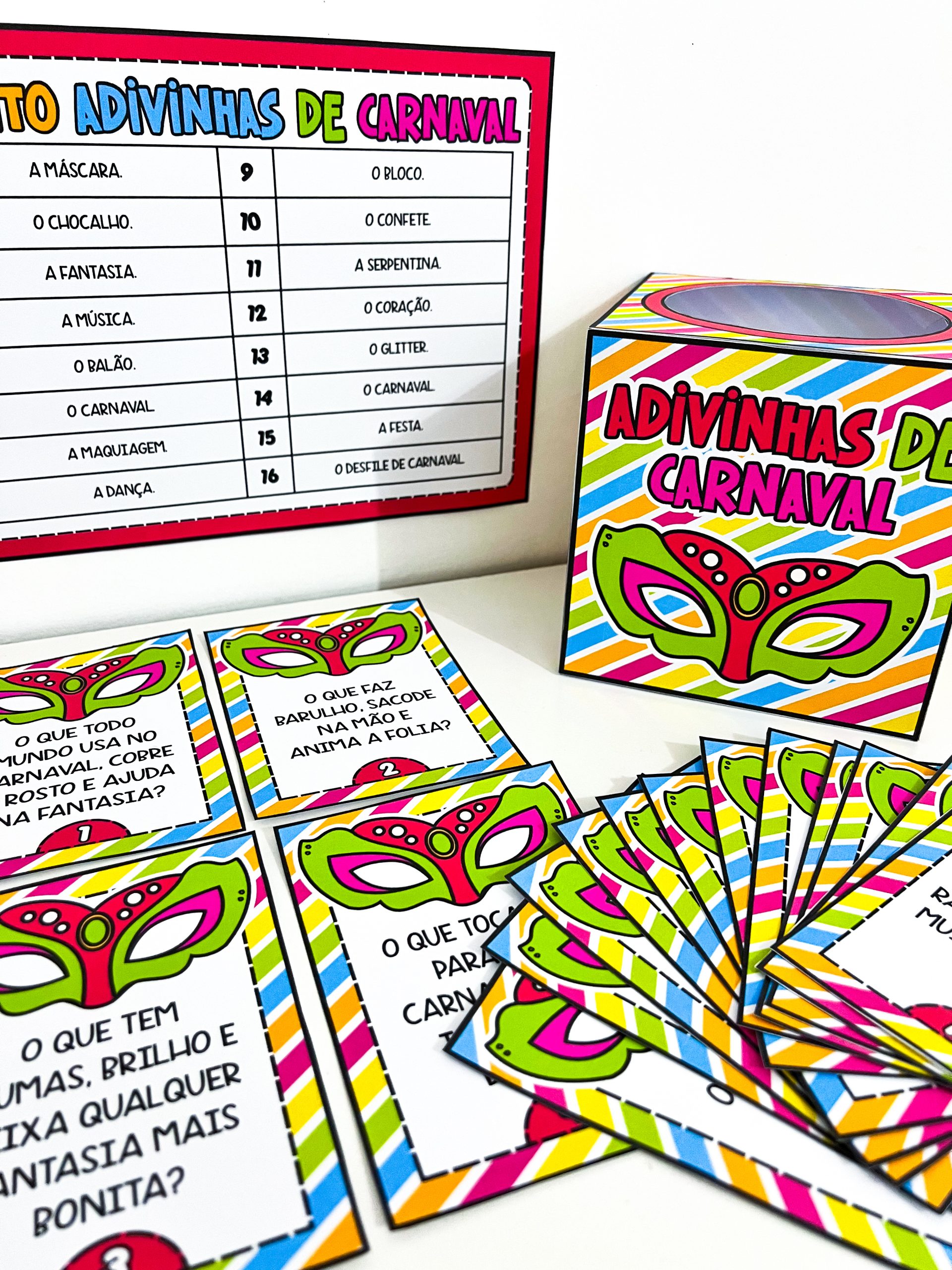 O conjunto contém um molde de caixa para guardar o material, 16 fichas de adivinhas com perguntas relacionadas ao Carnaval e um gabarito para conferência das respostas. É ideal para trabalhar em rodas de conversa, momentos de leitura, brincadeiras coletivas ou atividades especiais no período carnavalesco, promovendo a socialização e o aprendizado de maneira leve e prazerosa.