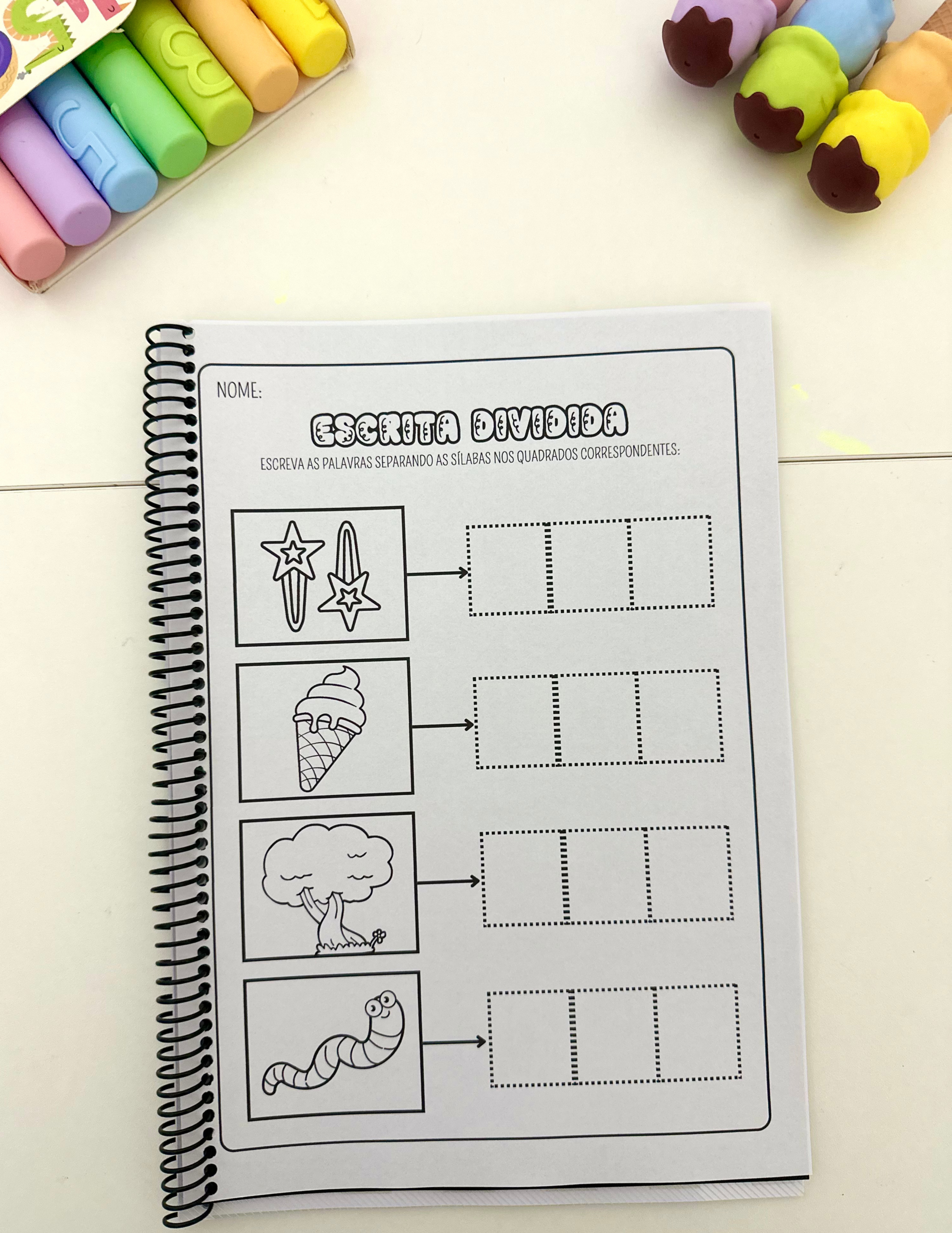 💡 Proposta que estimula a **escrita de palavras** de sílabas complexas, além de trabalhar **divisão de sílabas** e **autonomia** no momento da escrita 🧠🗂️.