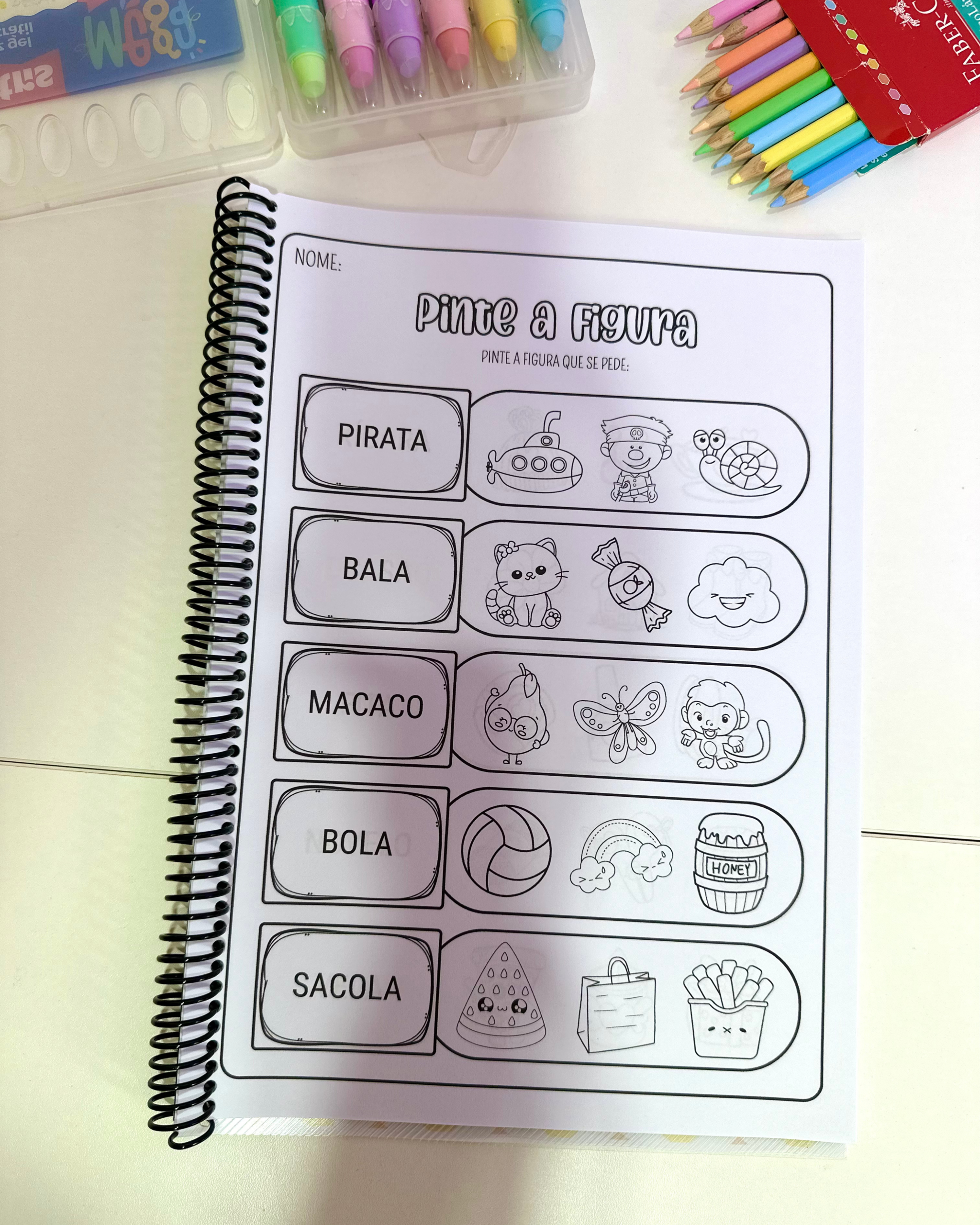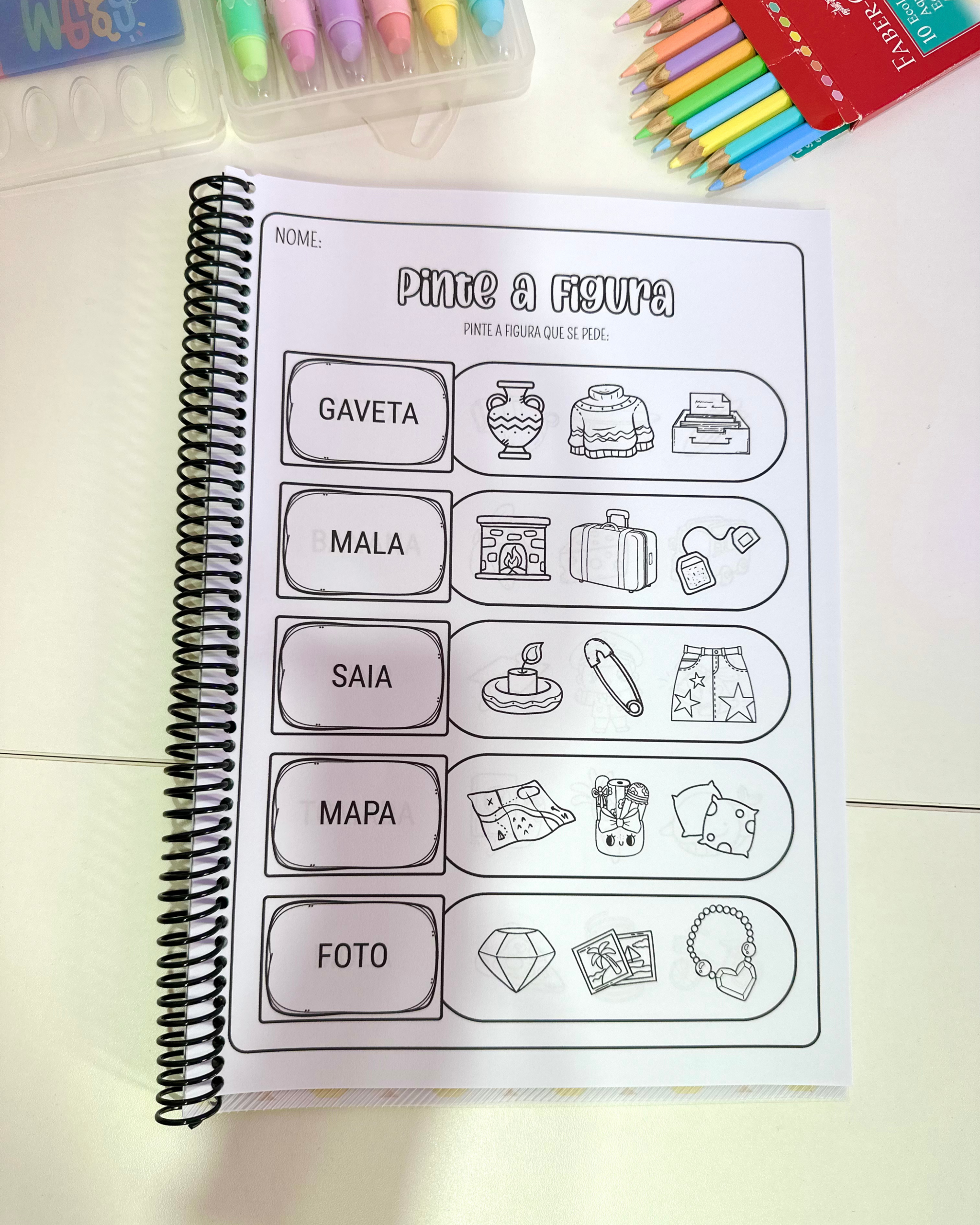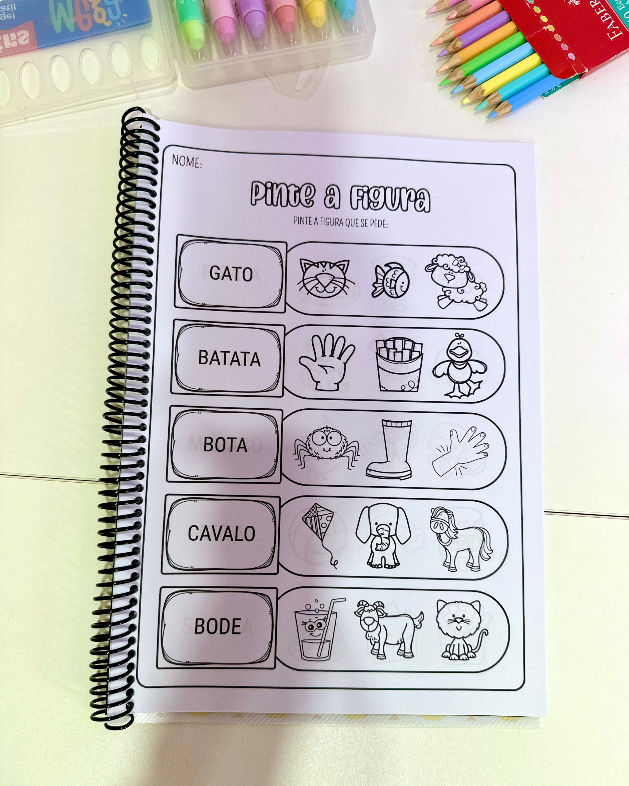 O arquivo vai com 16 páginas de atividades para colorir 🎨. Nessa proposta a criança precisa realizar a leitura da palavra 📖 e pintar a figura correspondente 🖌️.