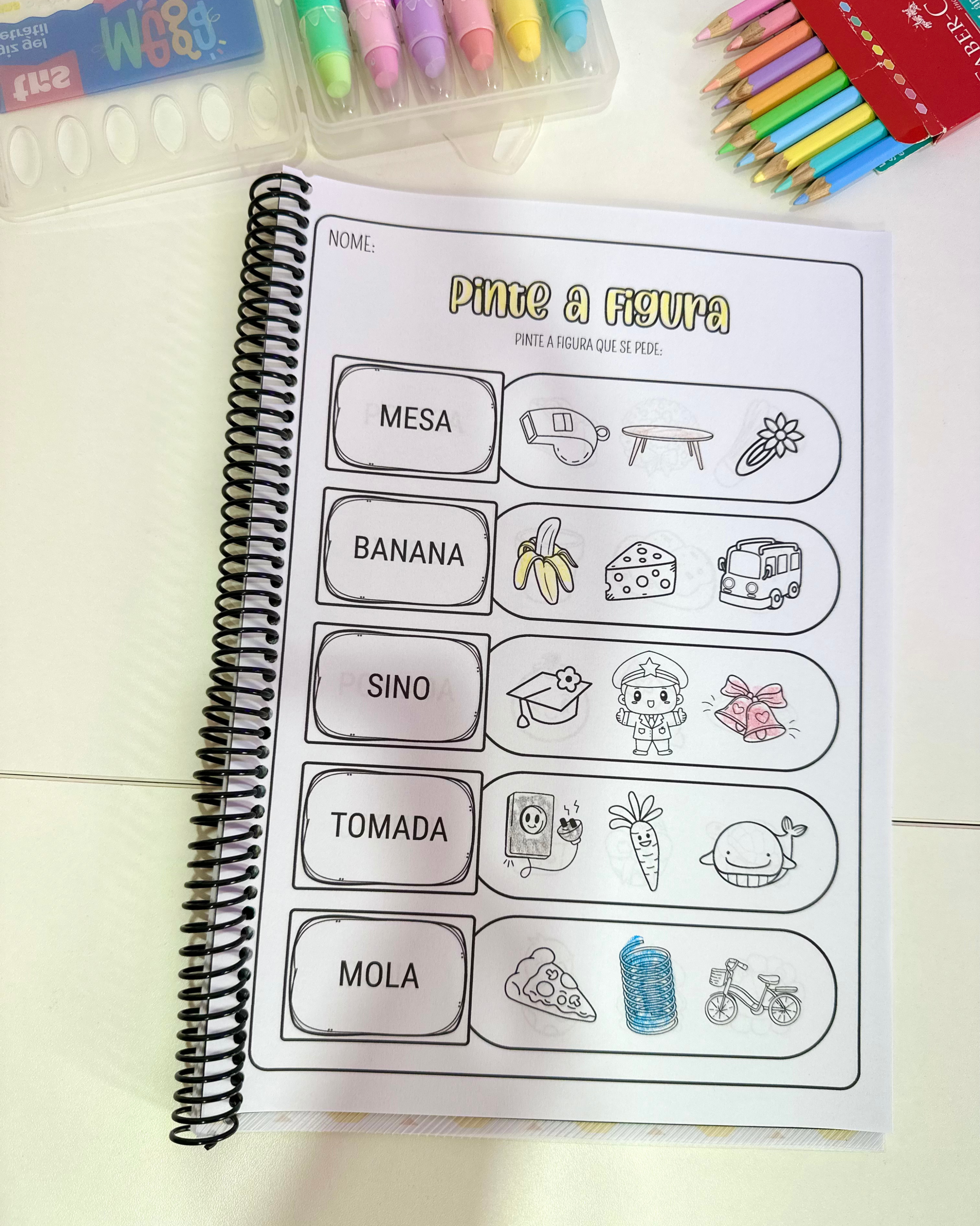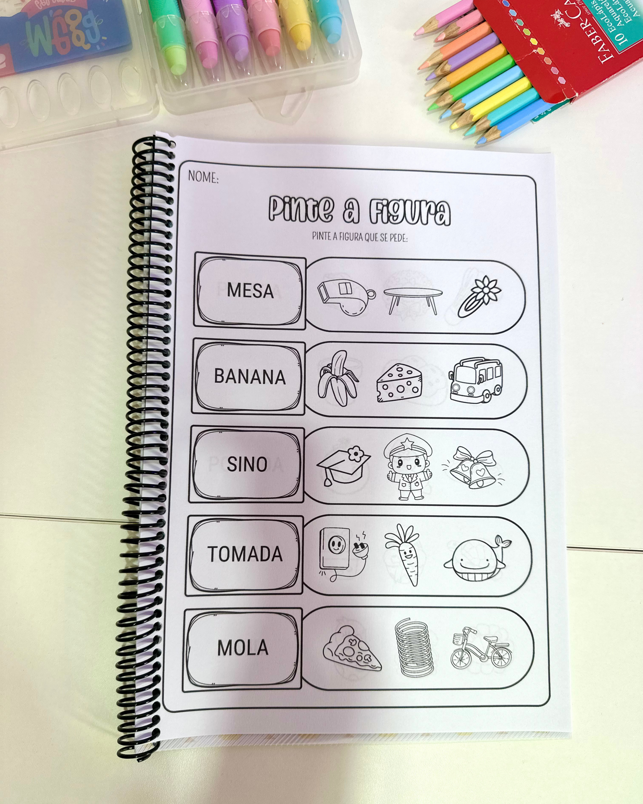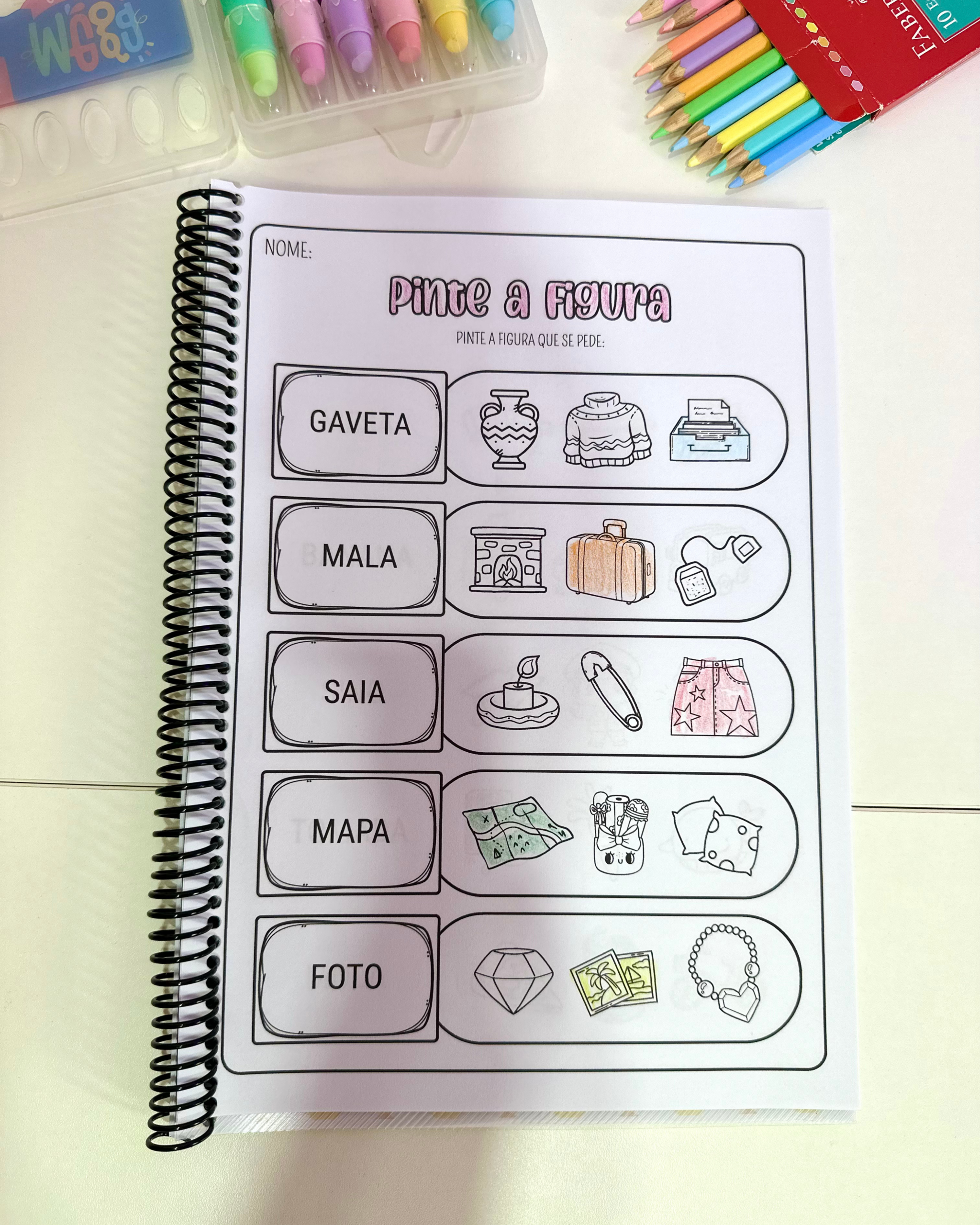O arquivo vai com 16 páginas de atividades para colorir 🎨. Nessa proposta a criança precisa realizar a leitura da palavra 📖 e pintar a figura correspondente 🖌️.