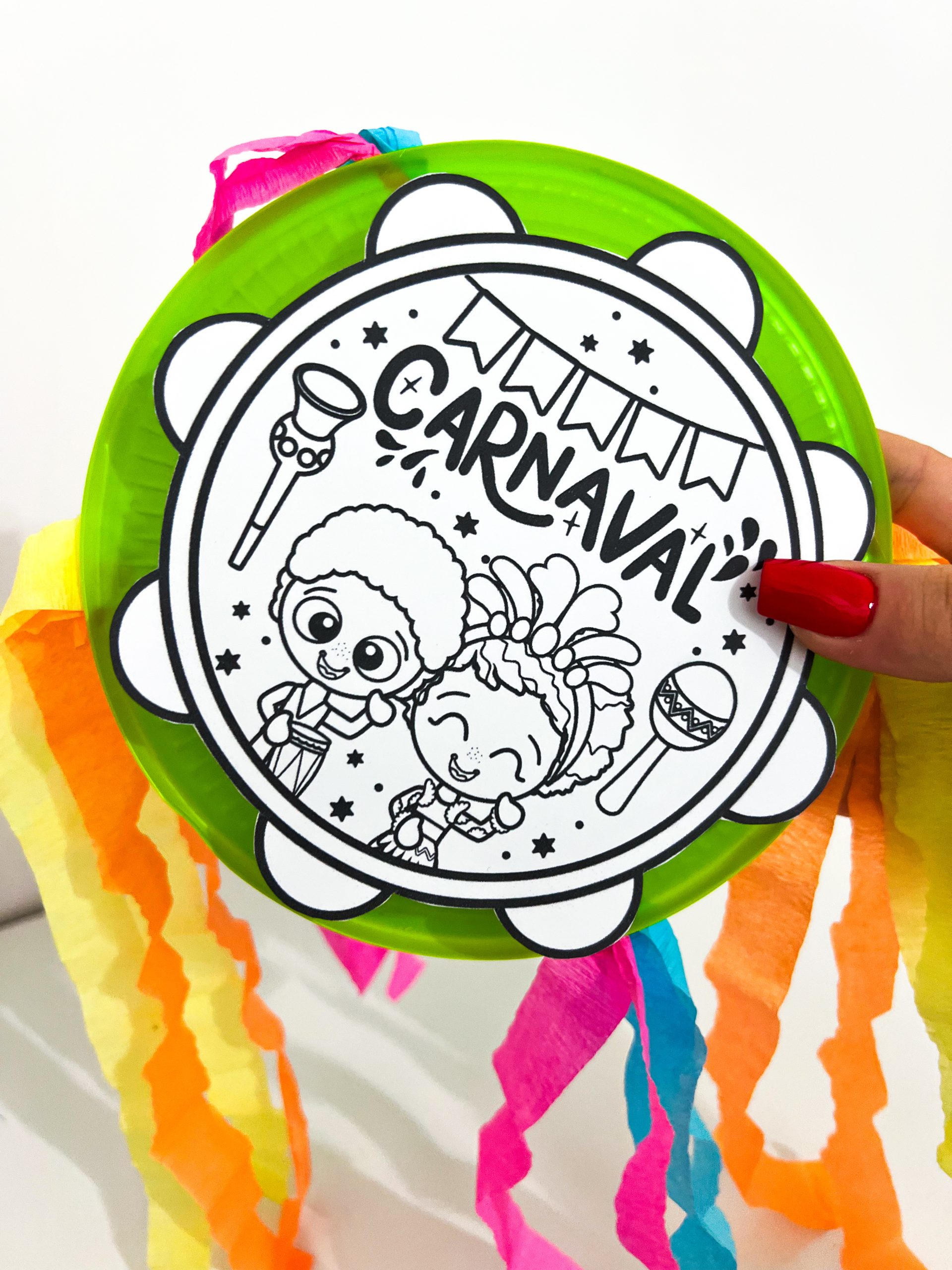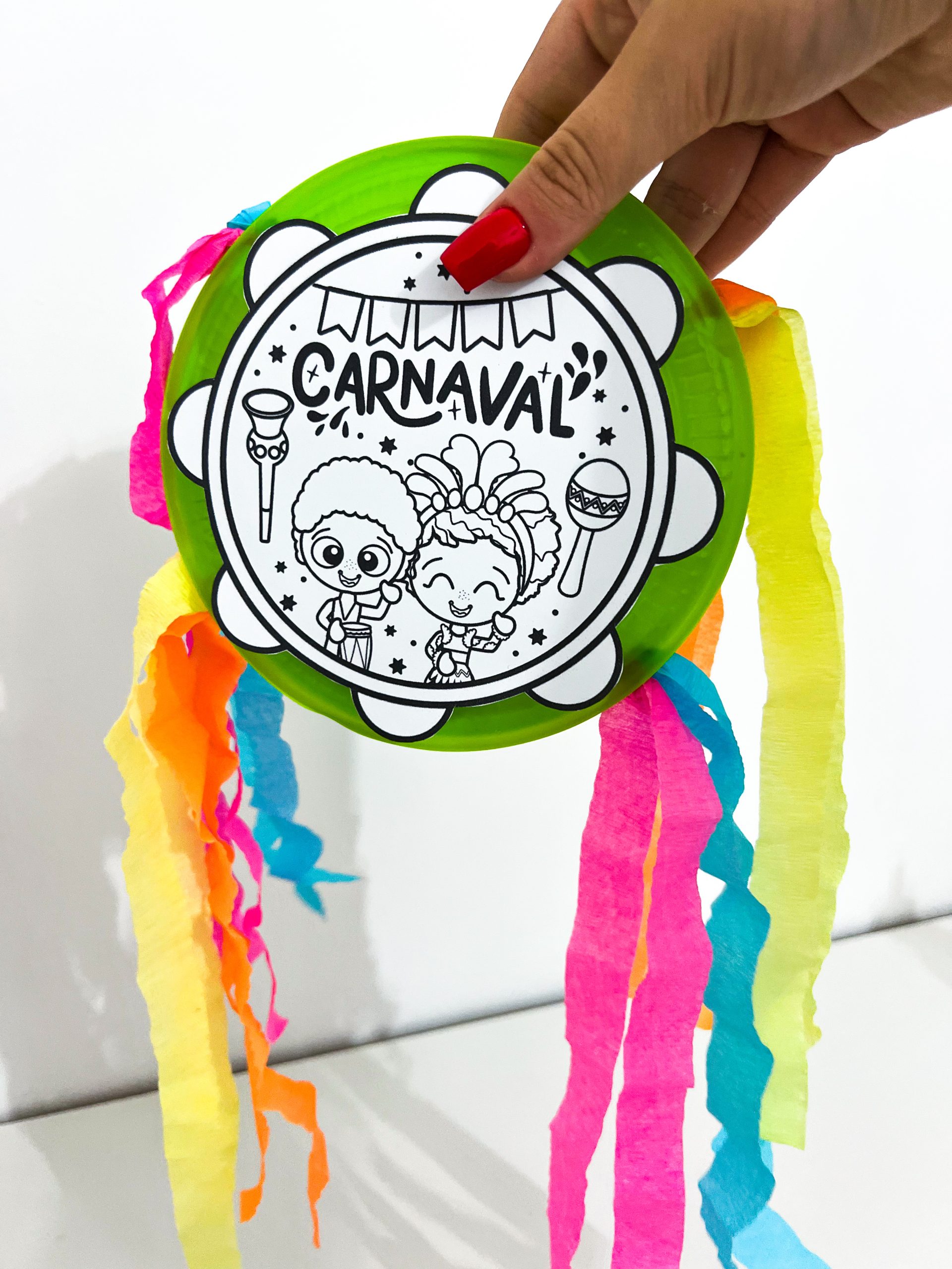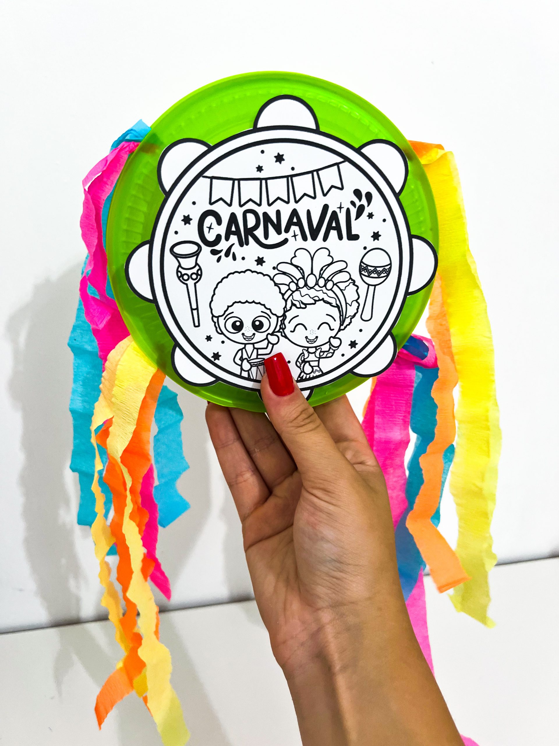 Para a realização da atividade, é necessário o arquivo do pandeiro, um prato plástico, tesoura, cola, papel crepom colorido e sementes que produzam som.