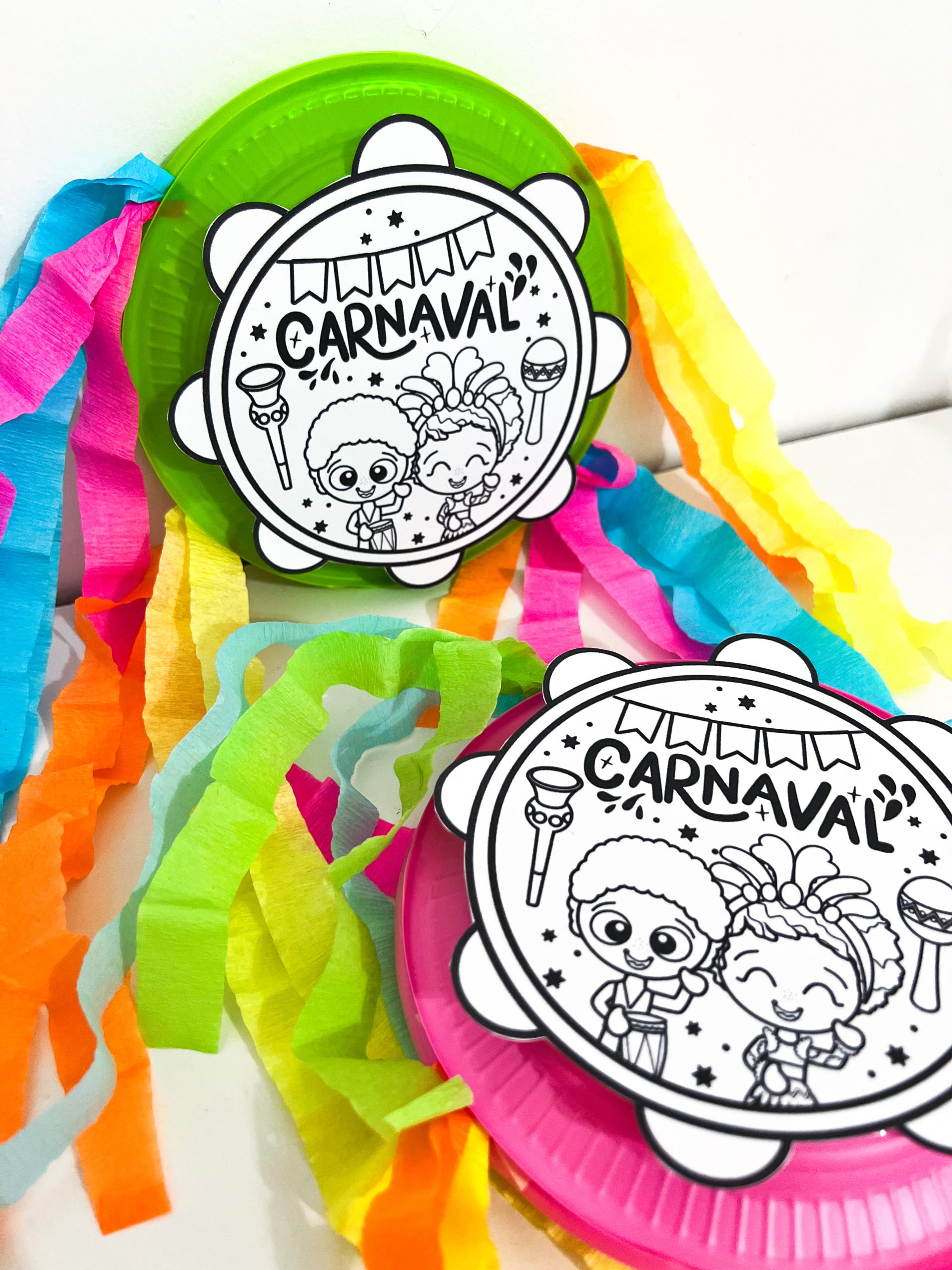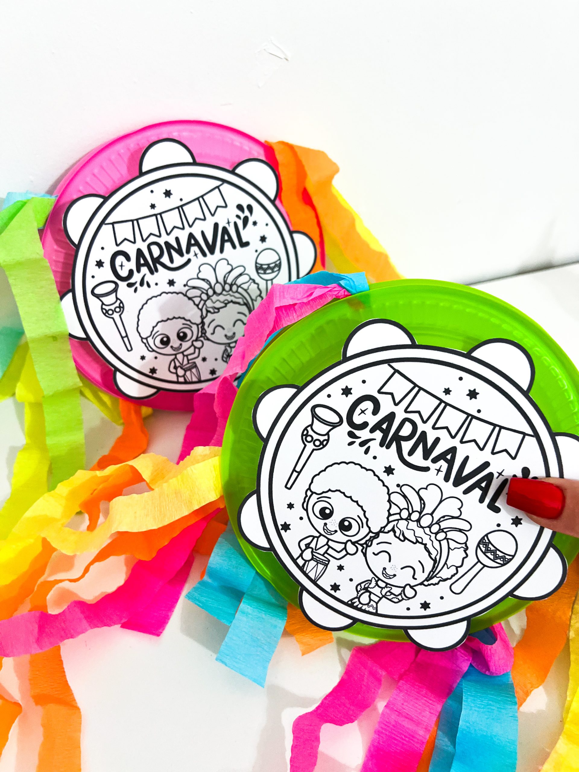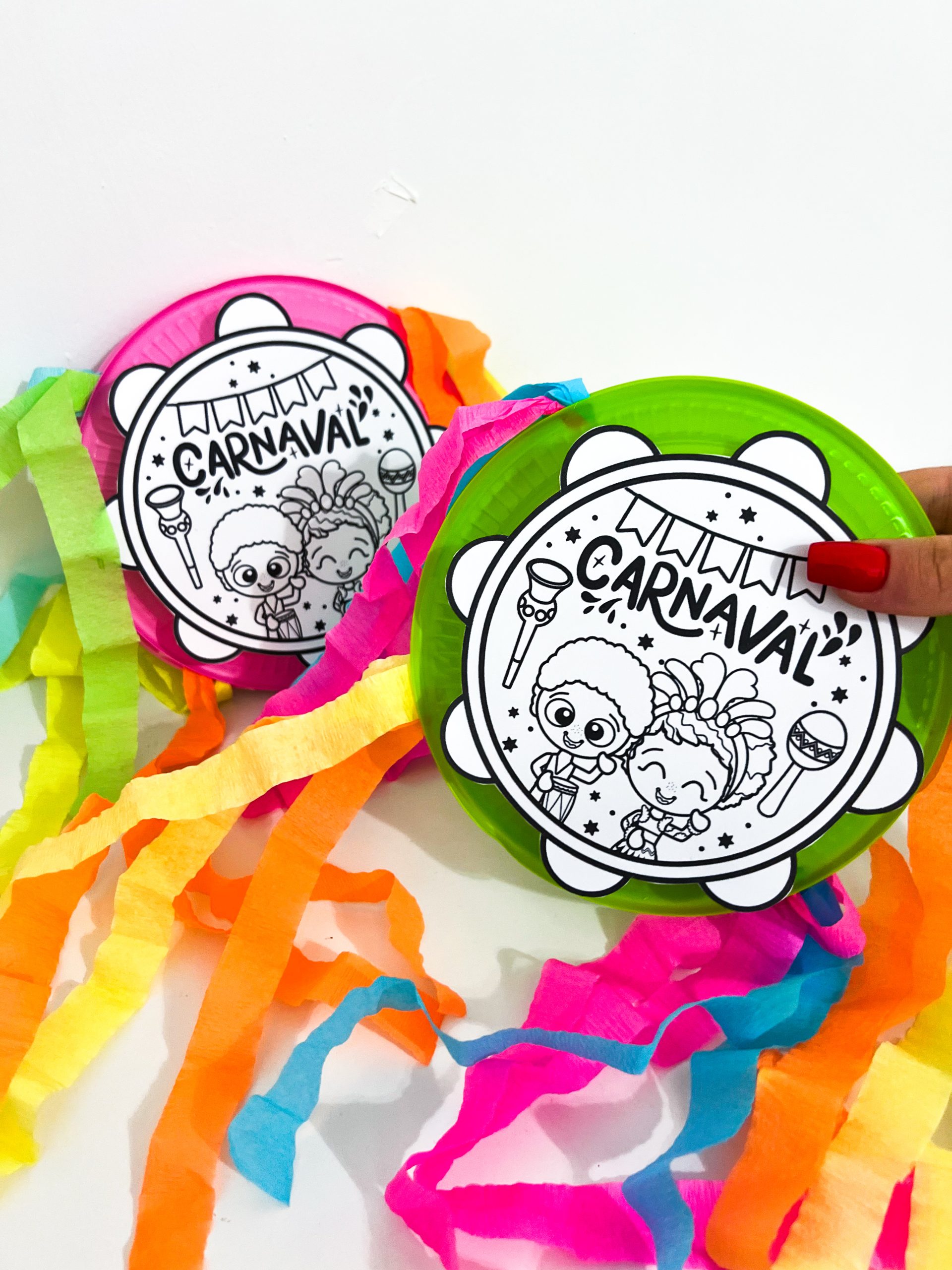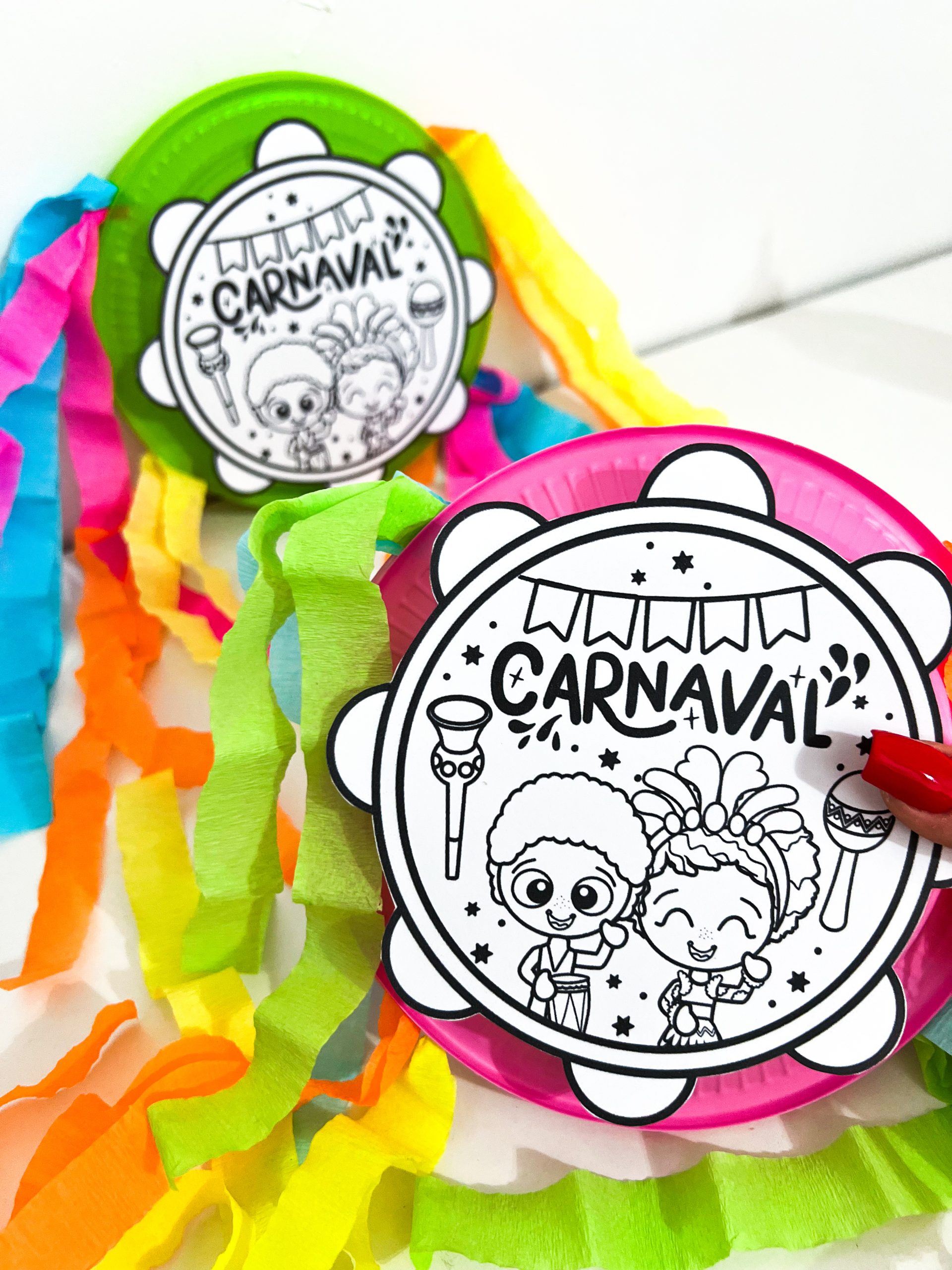 Para a realização da atividade, é necessário o arquivo do pandeiro, um prato plástico, tesoura, cola, papel crepom colorido e sementes que produzam som.