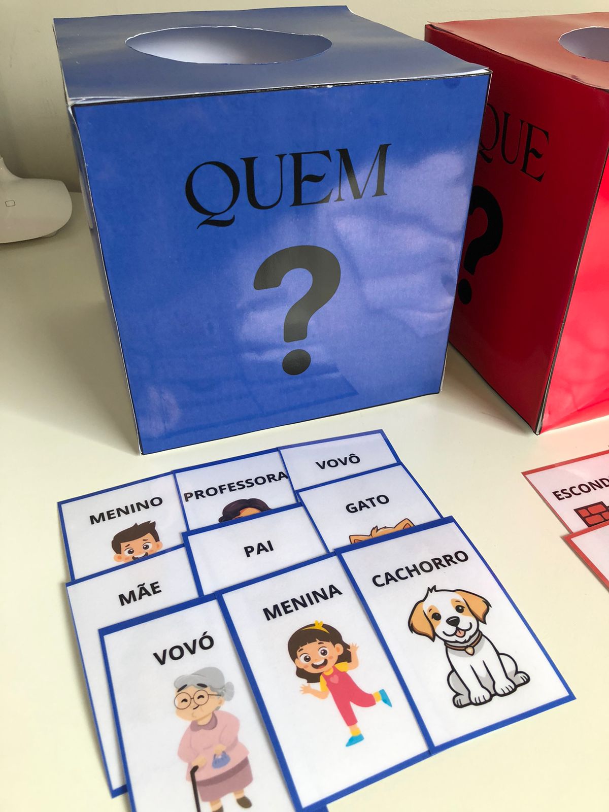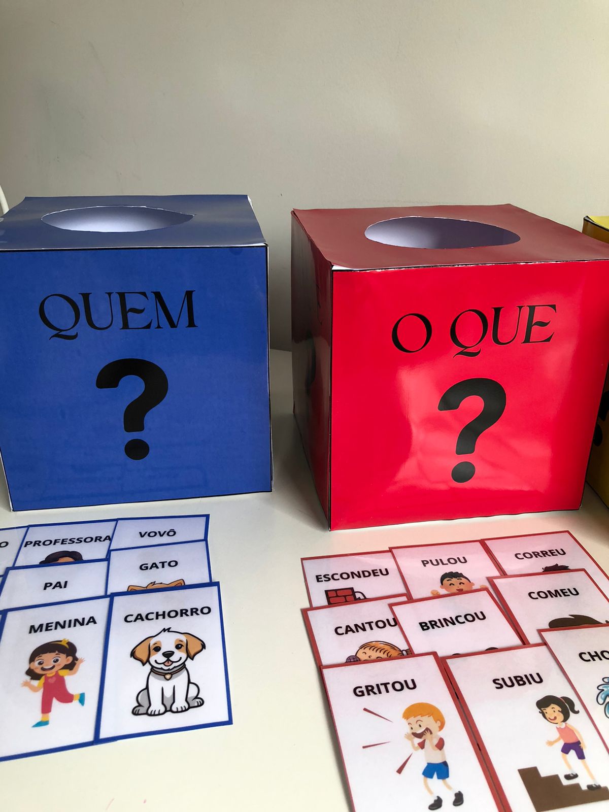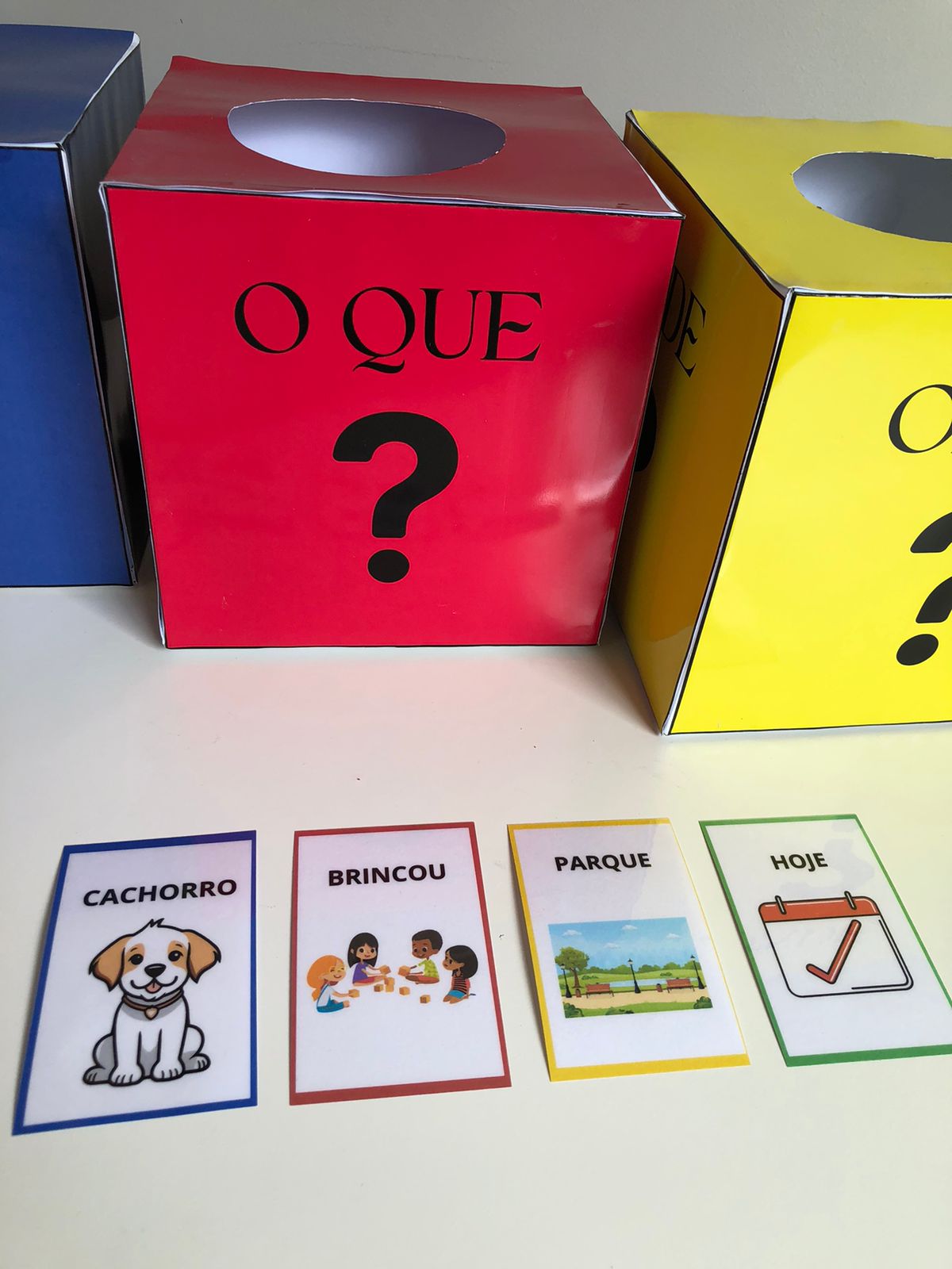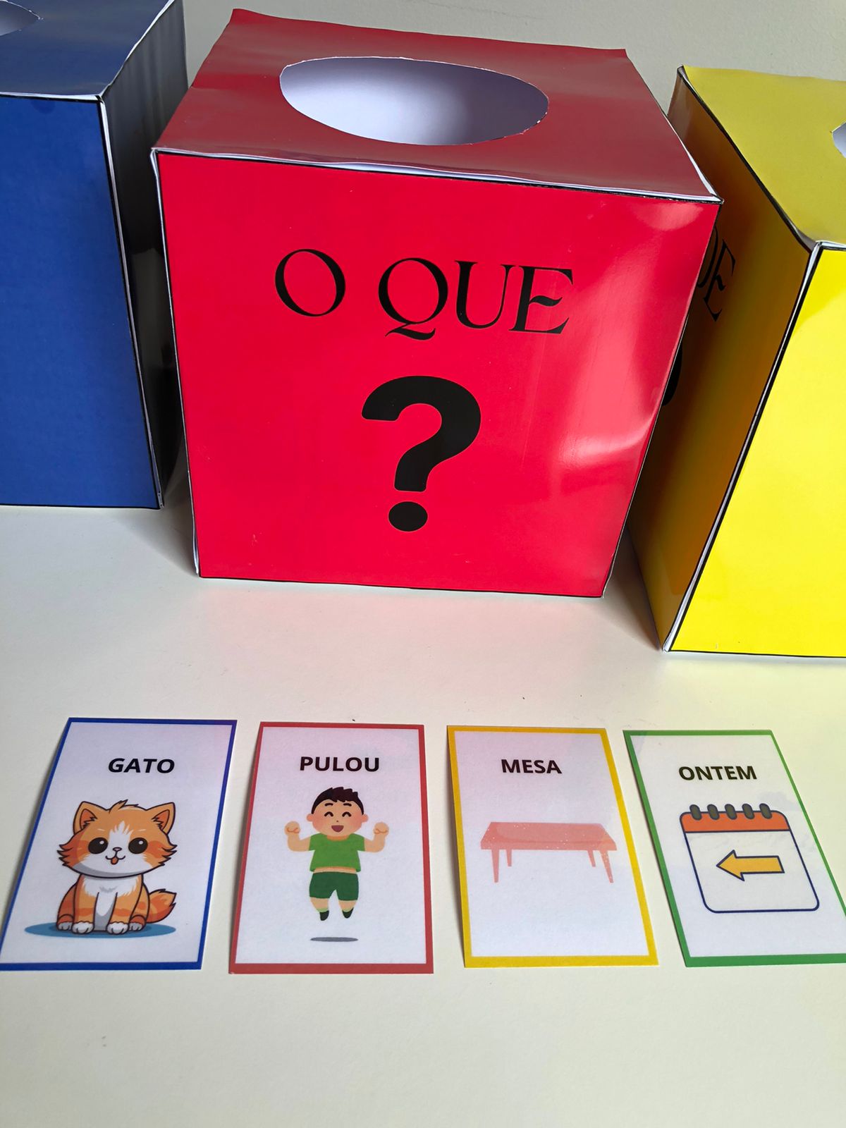 Com o Jogo de Formação de Frases, a criança retira um card de cada caixinha: