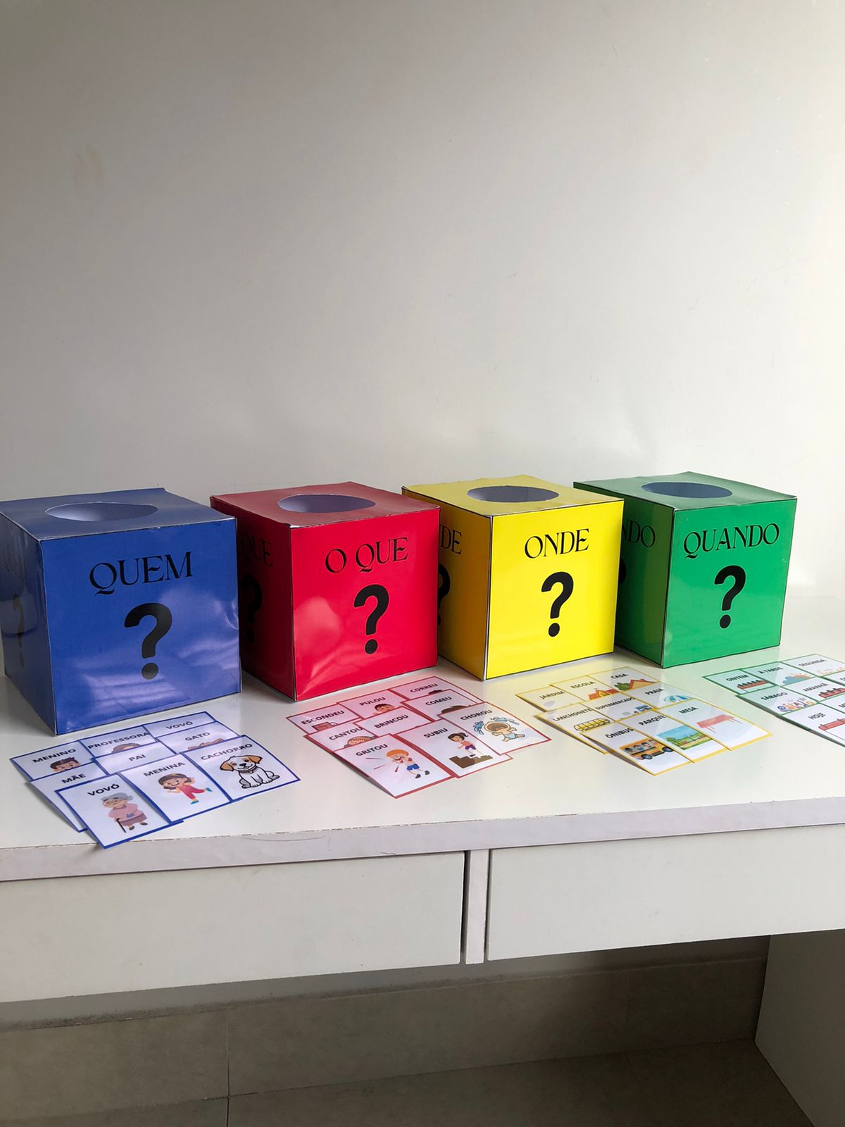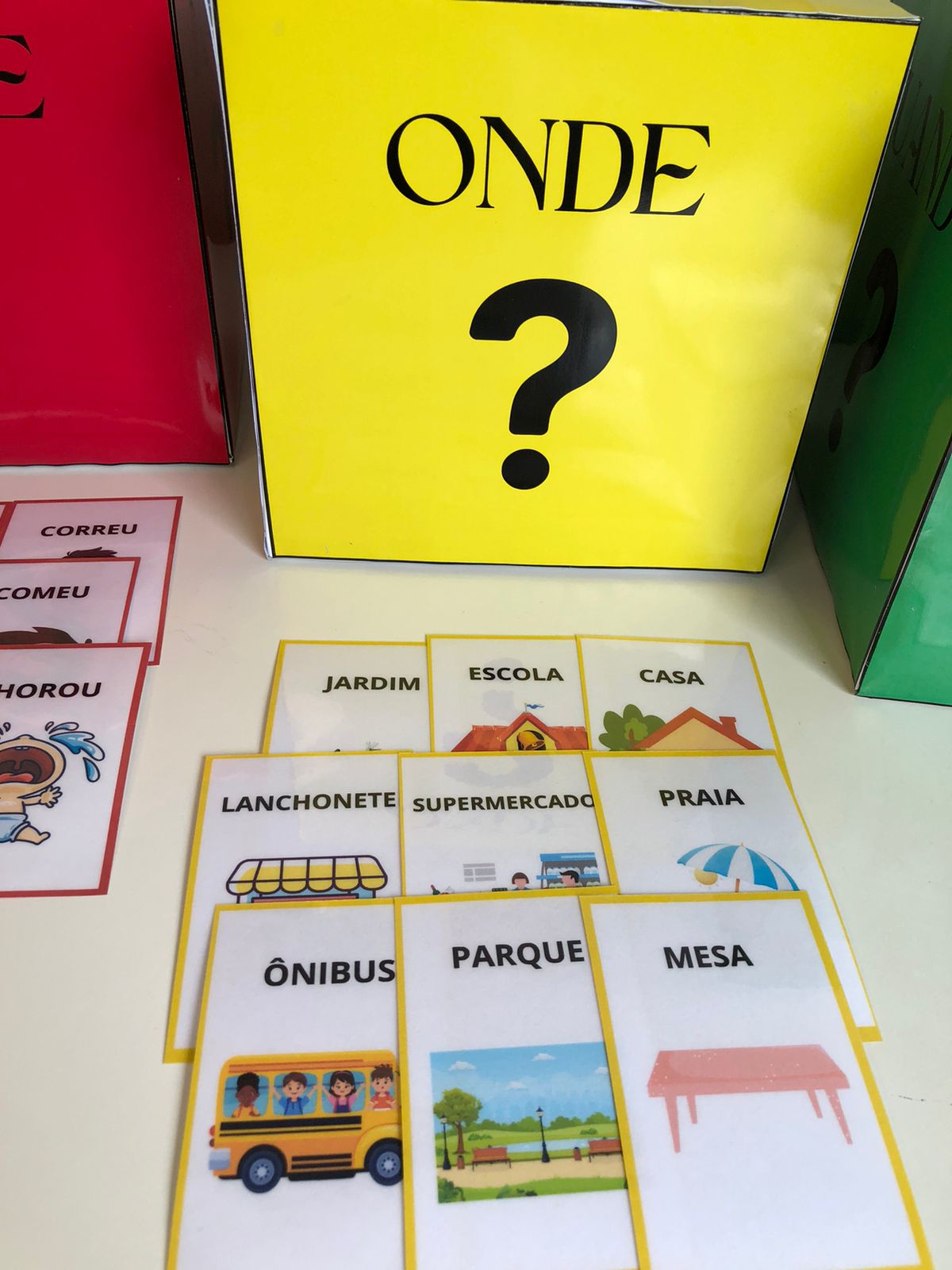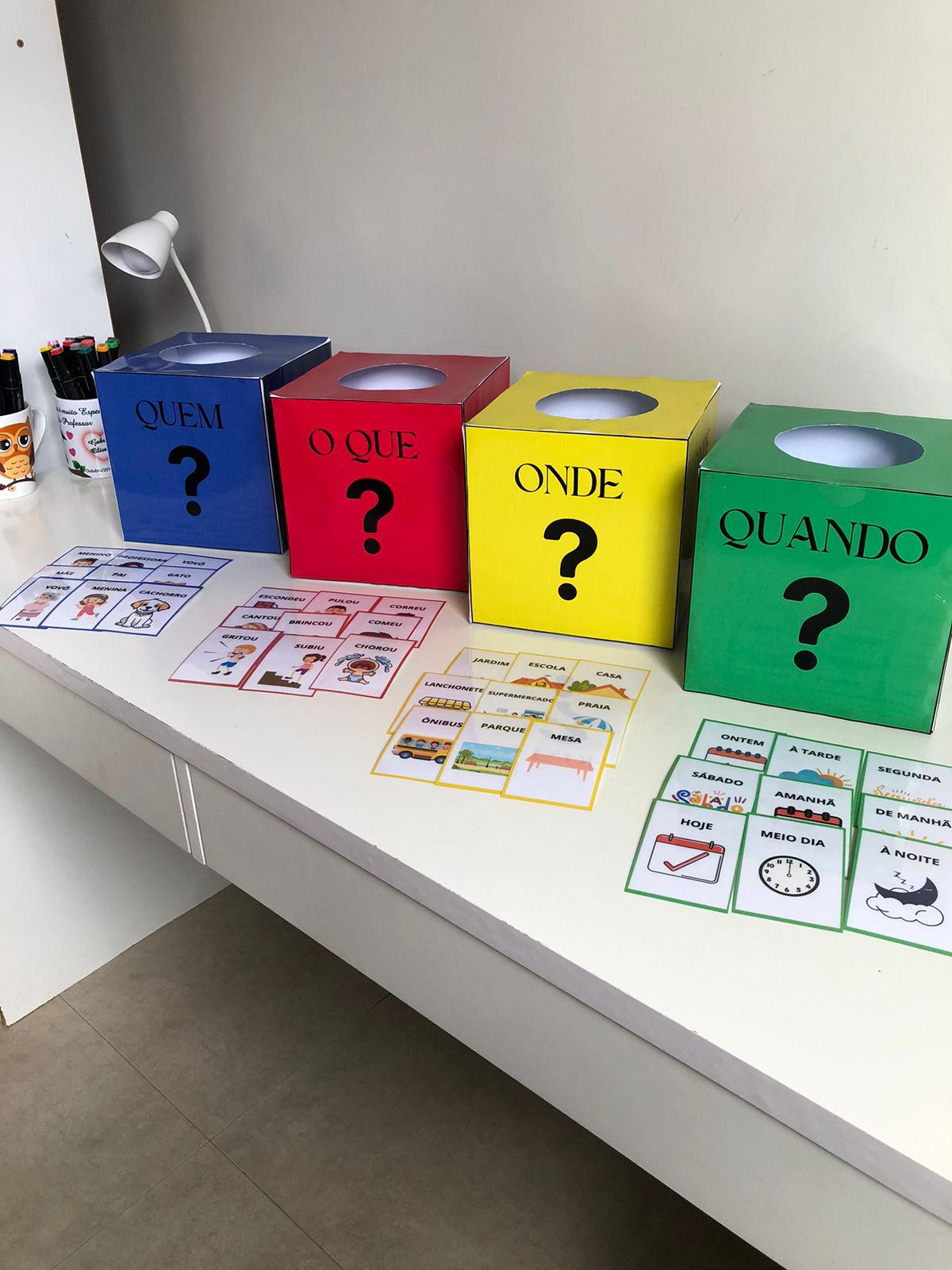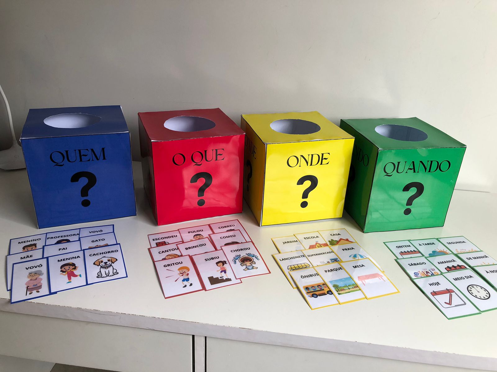 Com o Jogo de Formação de Frases, a criança retira um card de cada caixinha: