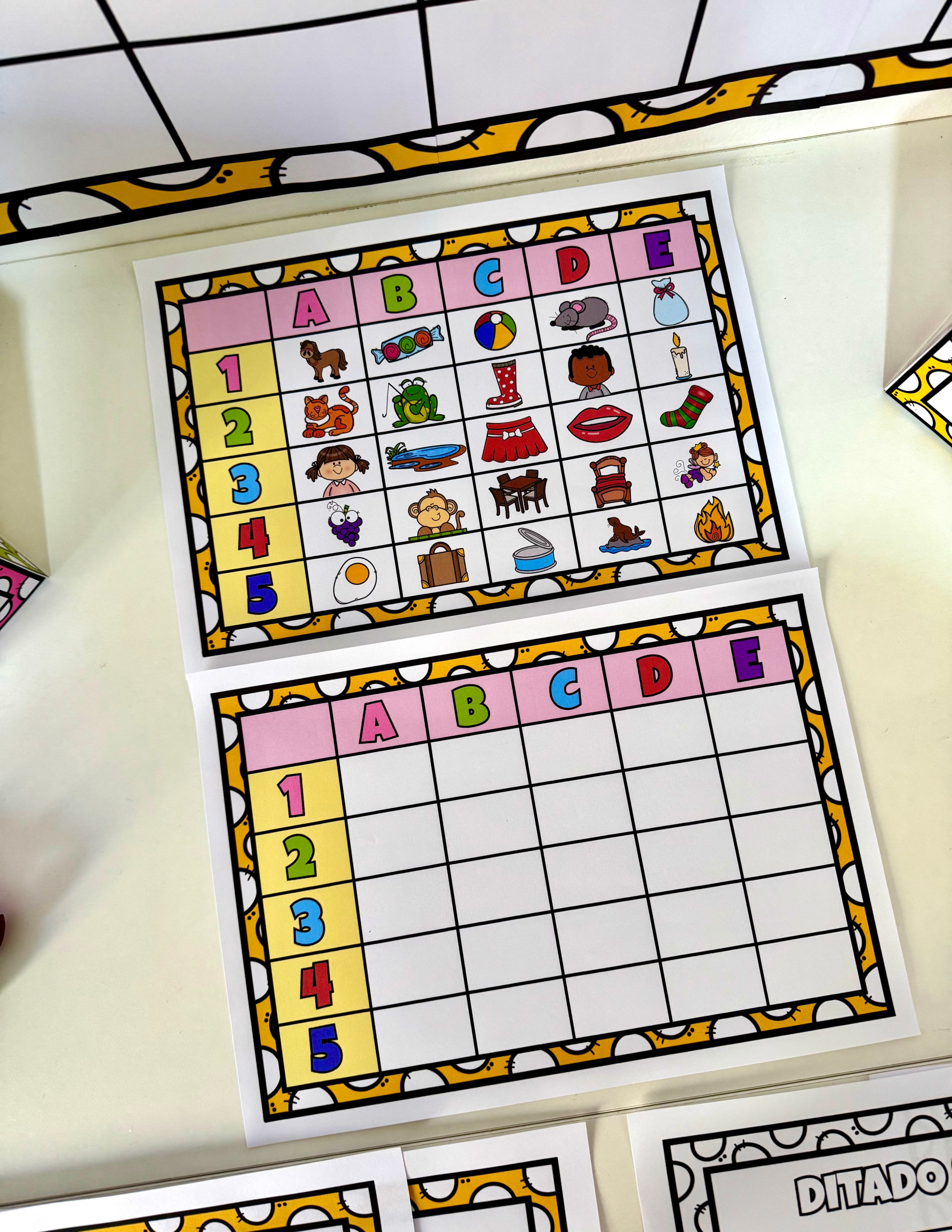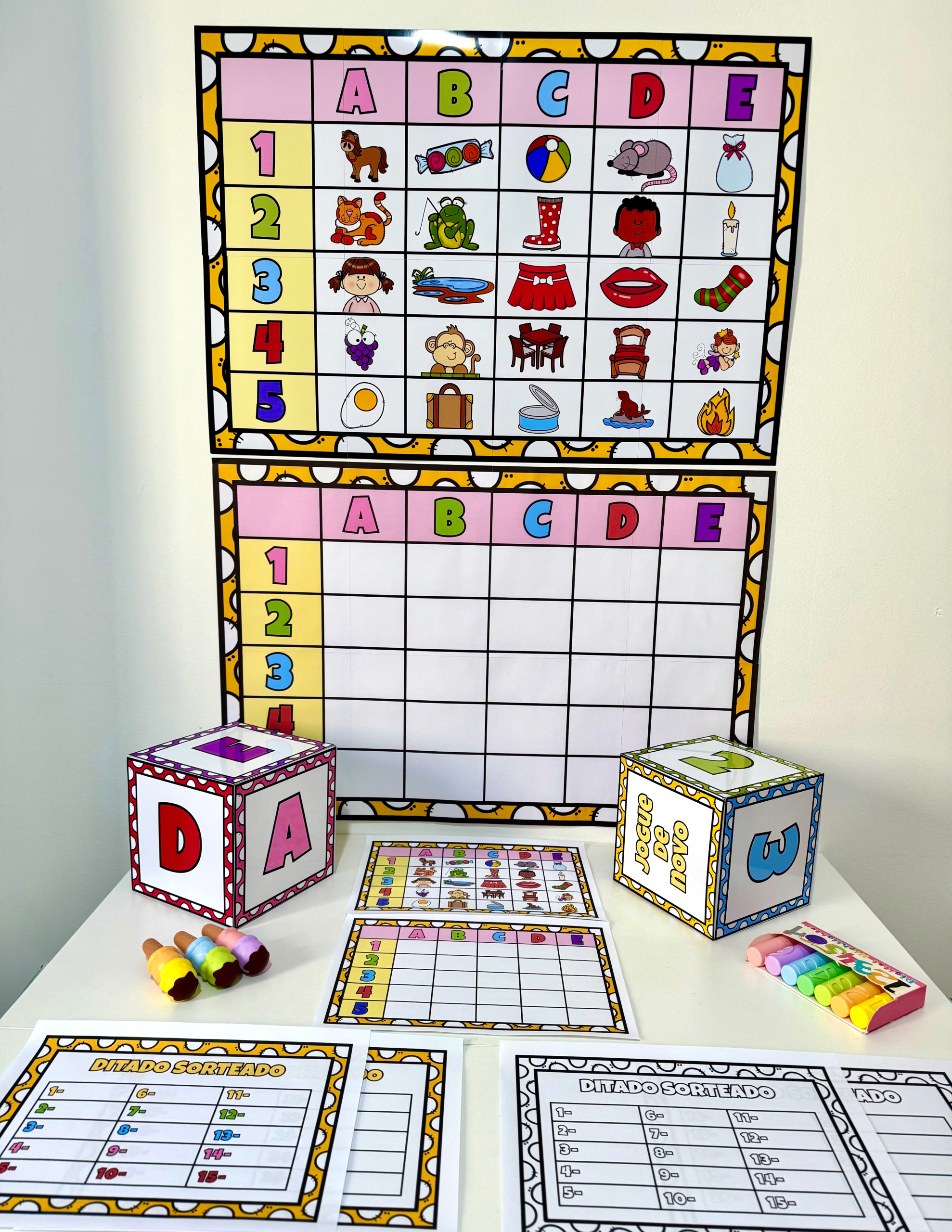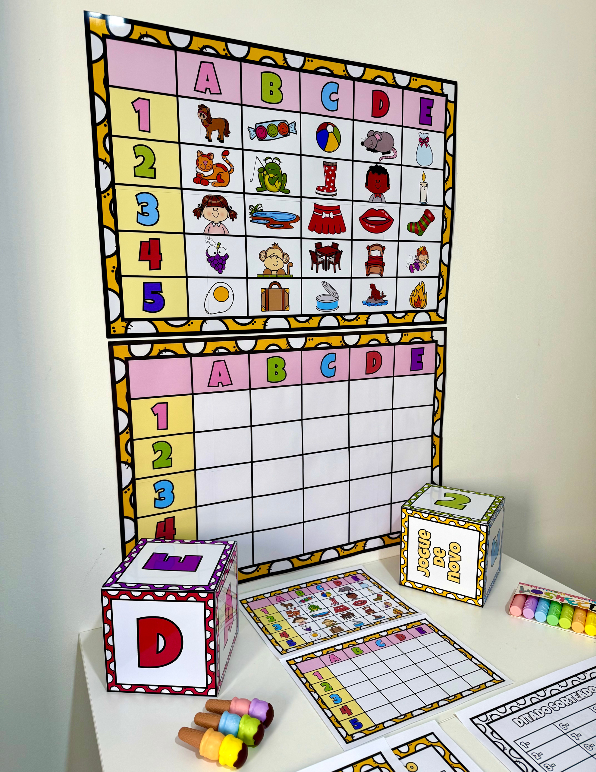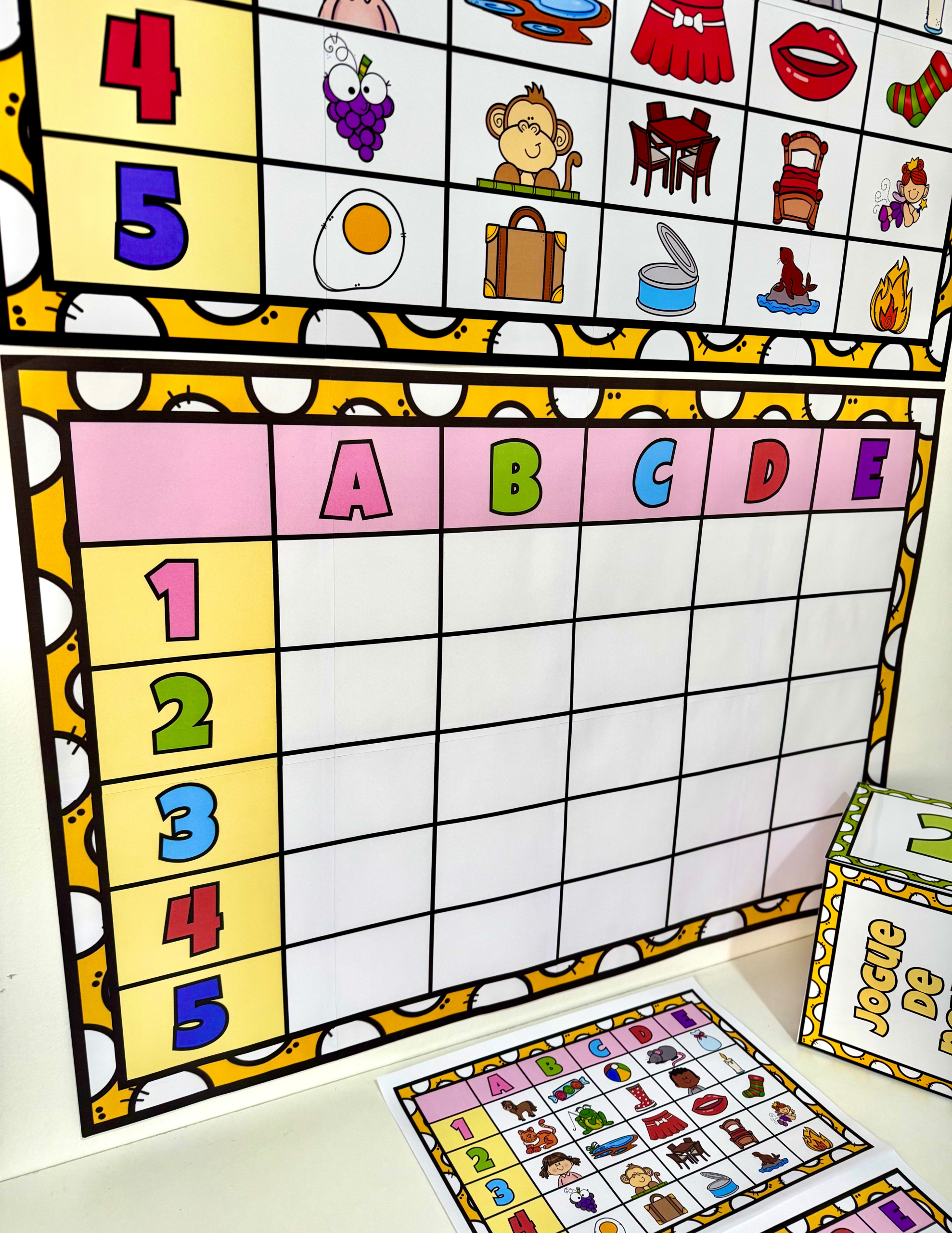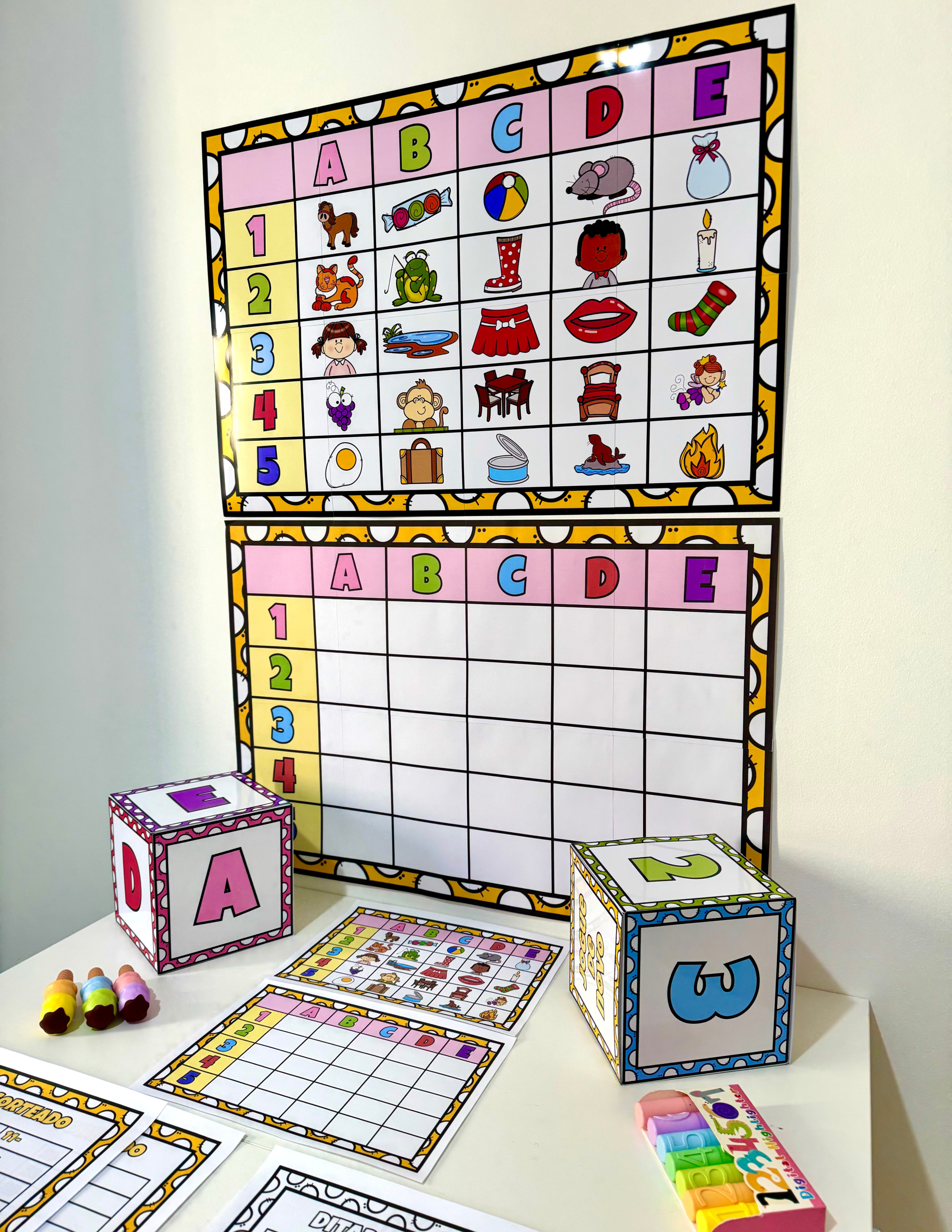 Nessa proposta a criança deverá jogar os dados 🎲, identificar a figura que se encontra na linha e na coluna sorteada 🔍 e realizar a escrita da palavra na tabela em branco. O material também acompanha folhas de registro na opção colorida e para colorir e as tabelas na opção A4. 🖍️📝 No total a tabela inclui 25 figuras diferentes. 🖼️
