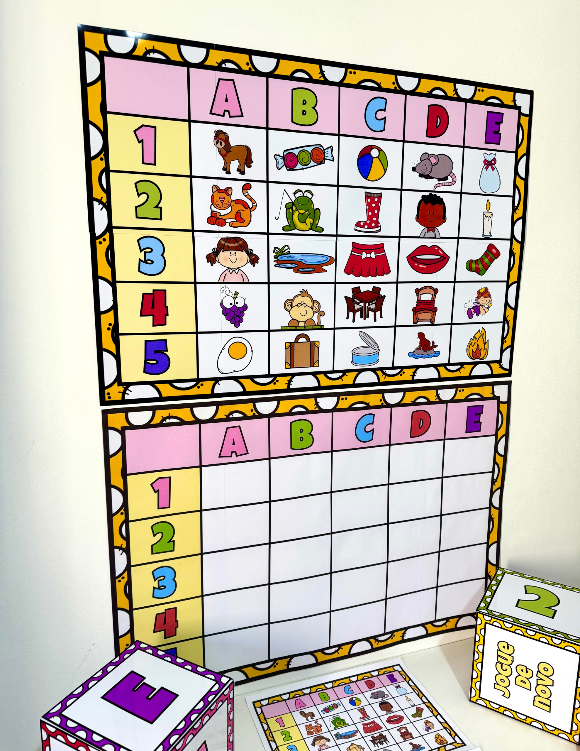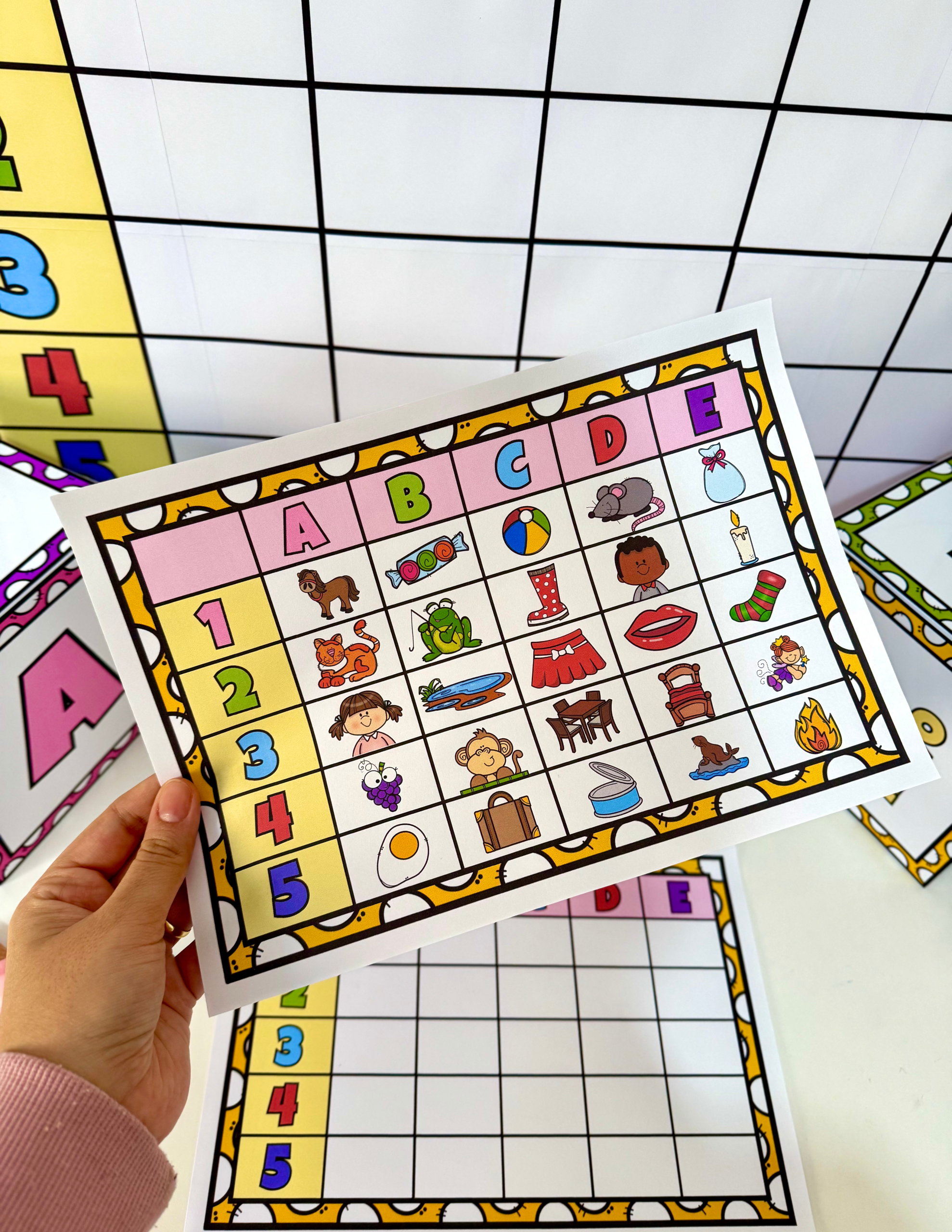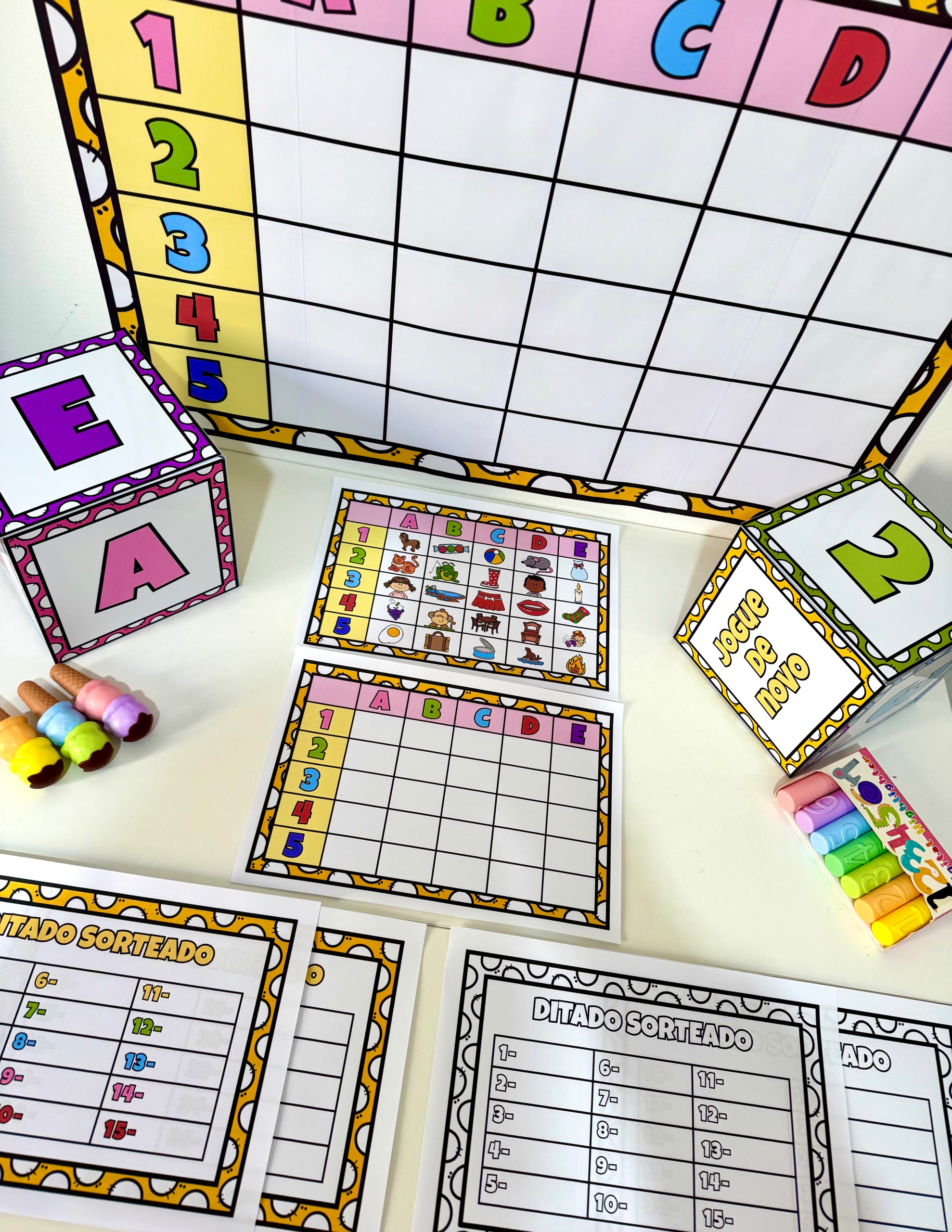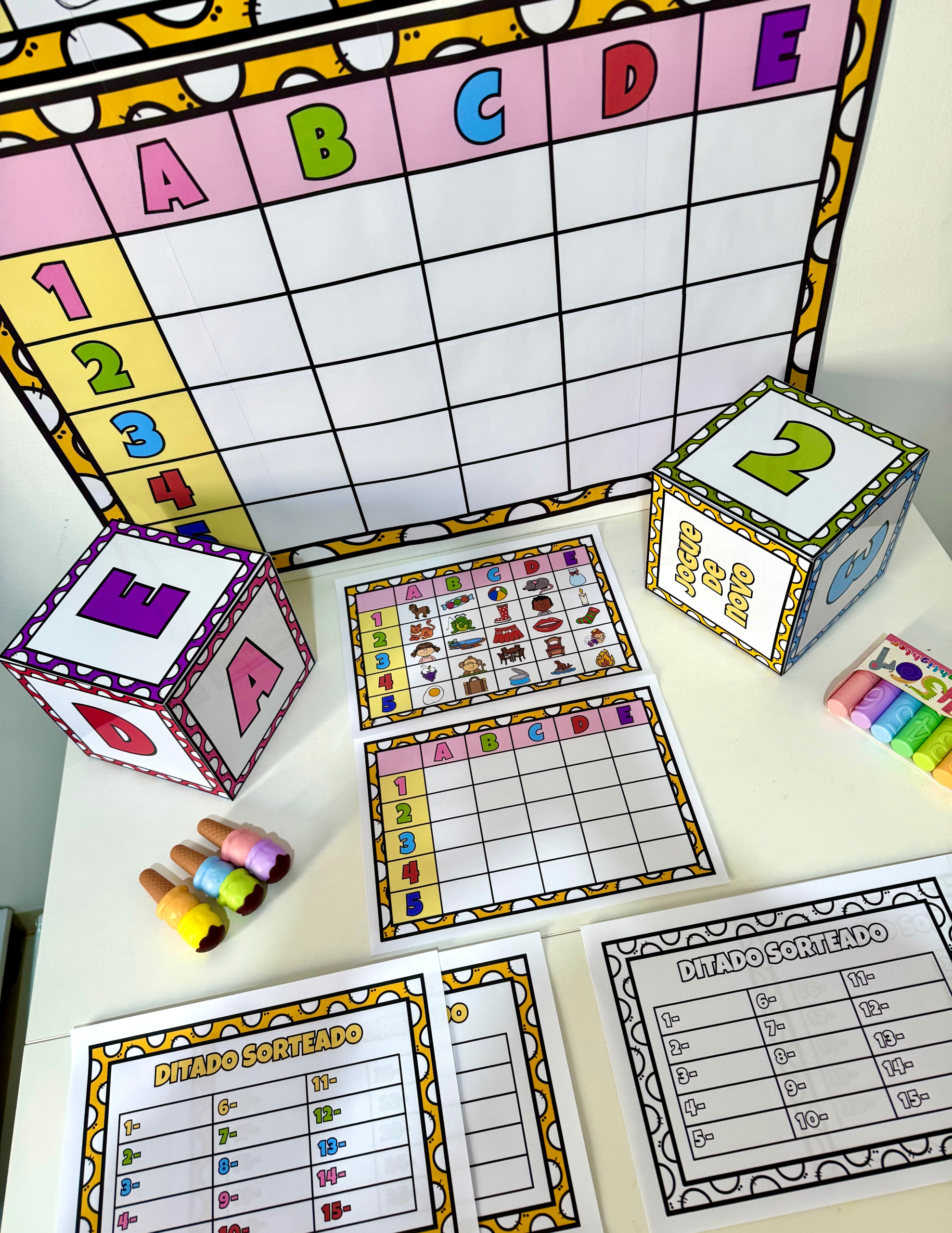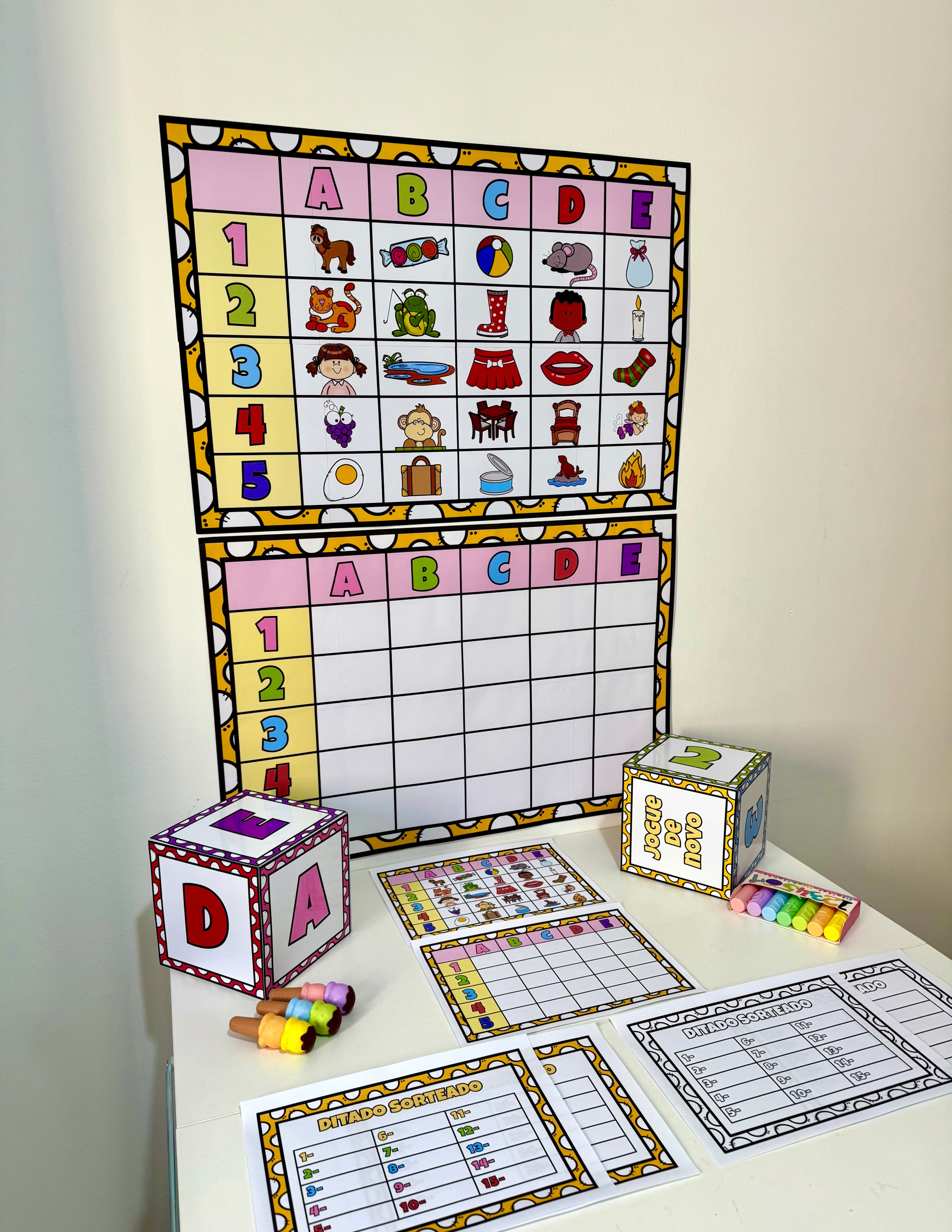 Nessa proposta a criança deverá jogar os dados 🎲, identificar a figura que se encontra na linha e na coluna sorteada 🔍 e realizar a escrita da palavra na tabela em branco. O material também acompanha folhas de registro na opção colorida e para colorir e as tabelas na opção A4. 🖍️📝 No total a tabela inclui 25 figuras diferentes. 🖼️
