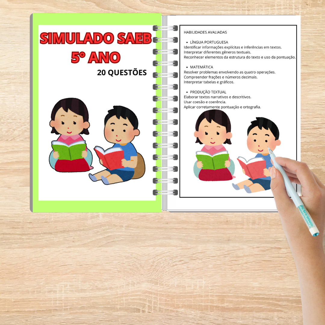 Nosso material conta com: ✅ 20 questões objetivas, seguindo o padrão do SAEB; ✅ Questões de Língua Portuguesa e Matemática, baseadas nas habilidades exigidas; ✅ Simulação realista para que você possa medir seu desempenho; ✅ Excelente ferramenta para alunos e professores acompanharem a aprendizagem; ✅ Formato pronto para impressão e aplicação!